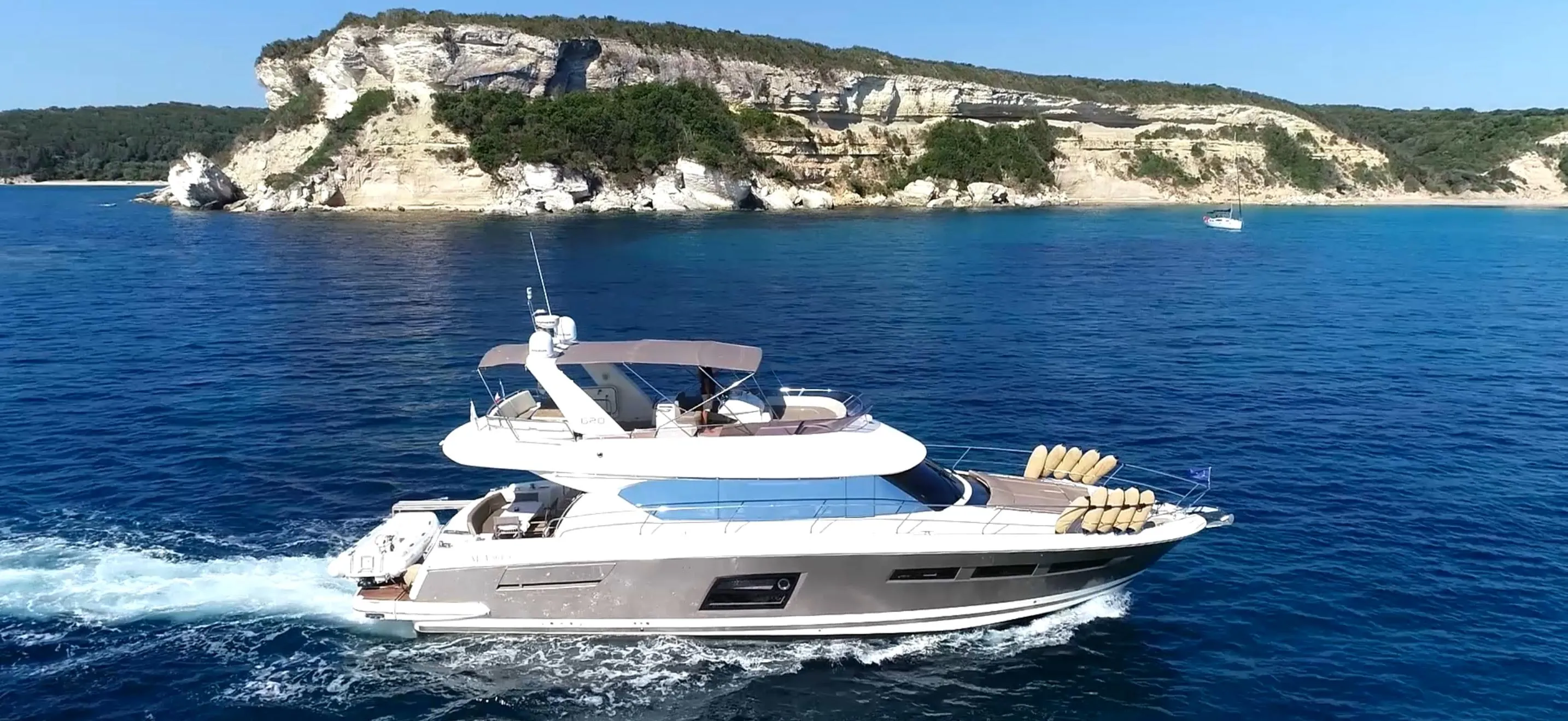 Measuring 19.02 metres in length with a beam of 5.12 metres, the Prestige 620 delivers generous interior volume and refined finishes throughout. The layout includes three well-appointed guest cabins, each with en-suite facilities, plus a separate crew cabin with private access and dedicated bathroom.