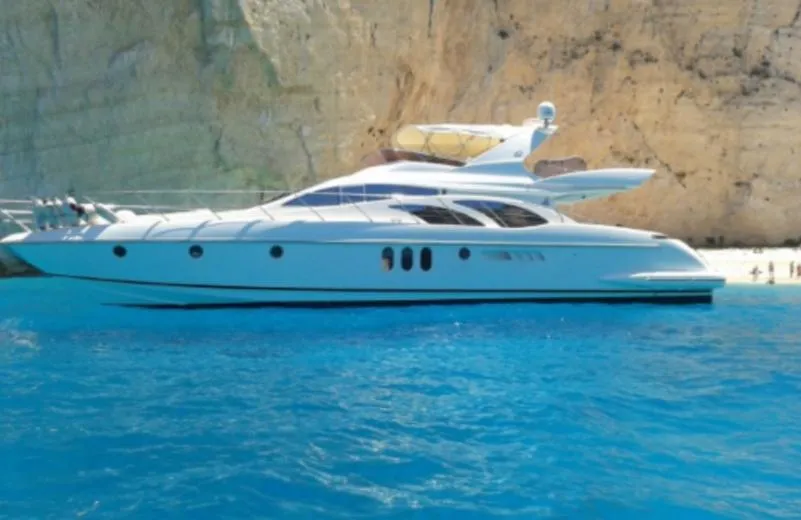 This is a 19,22m Azimut 62, luxury yacht for sale in Greece. Built in 2004 She has a Fibreglass (GRP) hull and superstructure with a beam of 5m and a draft of 1,30m. She can accommodate up to 6 guests in 3 cabins: a master suite, a VIP and a double cabin.