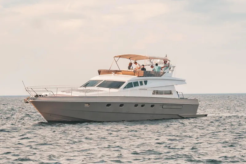 The yacht features a 19 kW Kohler generator and an 8 kW Kohler auxiliary generator, providing reliable onboard power for extended cruising or entertaining. Its flybridge offers panoramic views and ample space for socializing, while the main deck includes comfortable accommodations and a fully equipped galley for longer voyages.