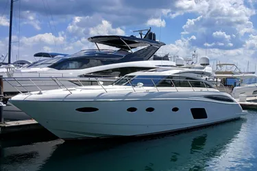 Introducing the stunning 2015 Princess V62-S, a remarkable cruiser that combines elegance with performance. With an impressive overall length of 63.5 feet, this vessel is crafted from durable fiberglass, ensuring both strength and a smooth ride. Powered by twin Caterpillar C18 A inboard engines, each delivering 1150 hp, this boat offers exceptional power and reliability, perfect for both leisurely cruising and spirited adventures. The engines have been well-maintained, with only 1850 hours of use, promising many more journeys ahead. Accommodating three cabins and two heads, the V62-S provides ample space for relaxation and comfort. This vessel is designed for those who appreciate luxury and functionality on the water. Experience the perfect blend of style and performance with the Princess V62-S, where every detail is crafted for an unforgettable boating experience.