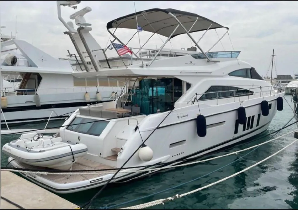 2015 Fairline Squadron 65, находящаяся в Италии, представляет собой 19,92-метровую моторную яхту класса люкс в отличном состоянии. Имея ширину 5,24 метра, она с комфортом вмещает восемь гостей в четырех хорошо оборудованных каютах, включая просторную мастер-каюту и VIP-каюту, обе с двуспальными кроватями, а также две гостевые каюты. Яхта оснащена высококлассными аудиовизуальными системами, полностью укомплектованным камбузом, а также обширным палубным и навигационным оборудованием. Оснащенный двигателями Caterpillar общей мощностью 1 100 л.с. и 865 часами, он развивает максимальную скорость 32 узла и комфортно развивает крейсерскую скорость 27 узлов. Дополнительные функции включают носовое и кормовое подруливающие устройства, гидравлическую плавательную платформу и тендер Williams длиной 3,25 фута. Яхта, зарегистрированная на Мальте, облагается НДС в Испании и Египте и стоит 1 450 000 евро.