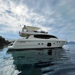 The 2007 Ferretti 630 is a stunning flybridge motor yacht blending elegant Italian design with exceptional performance. Measuring 19.94 meters in length with a 5.54-meter beam, it is powered by twin MAN engines producing 1250 HP each, delivering a cruising speed of 18 knots and a top speed of 35 knots.