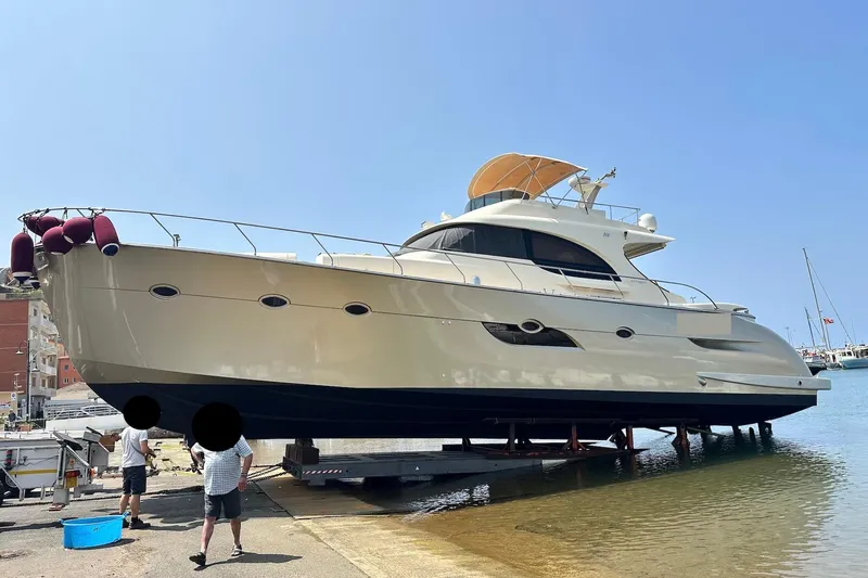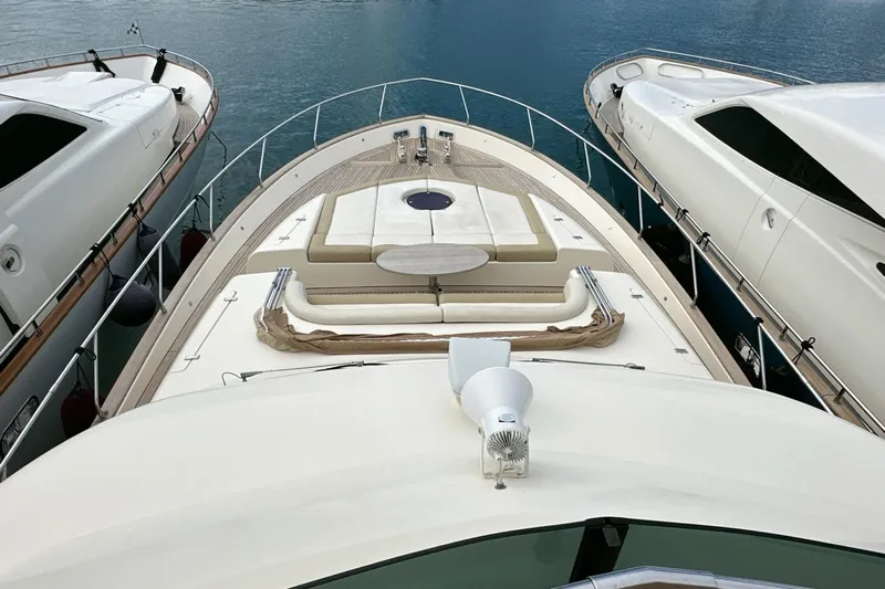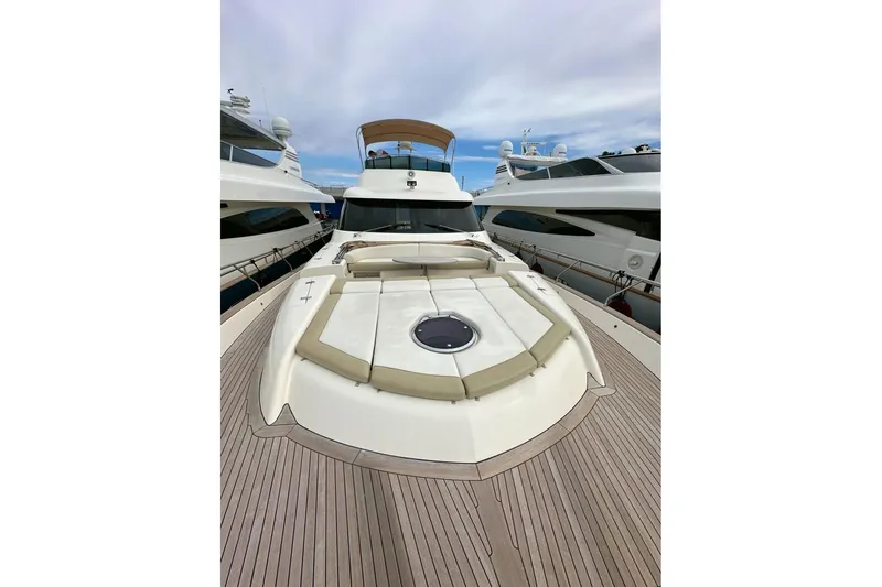 Layout interno composto da cabina armatore a centro barca con letto matrimoniale e toilette privata suddivisa in due locali; cucina accessoriata al piano del salone, locale con cantina vini e acquaio e labvatrice. Cabina ospiti con letti singoli affiancati, cabina VIP a prua con toilette privata e box doccia. Flybridge con postazione di comando e prendisole. Ampio prendisole prua con divano e sedute e tendalino. Pozzetto comodo con tavolo, piattaforma bagno, garage tender. Cabina equipaggio (2) a poppa con ingresso dal pozzetto