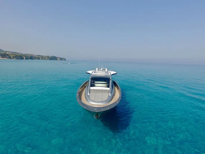 The zenithal light illuminates from the large windshield the galley below, and from the glazed broadside - for the first time in "shatterproof Lexan" - one can fully enjoy the sea and its coastline. The futuristic lines of a performance boat are contrasted by the safety of the wide "walk around" and the child-proof handrail.