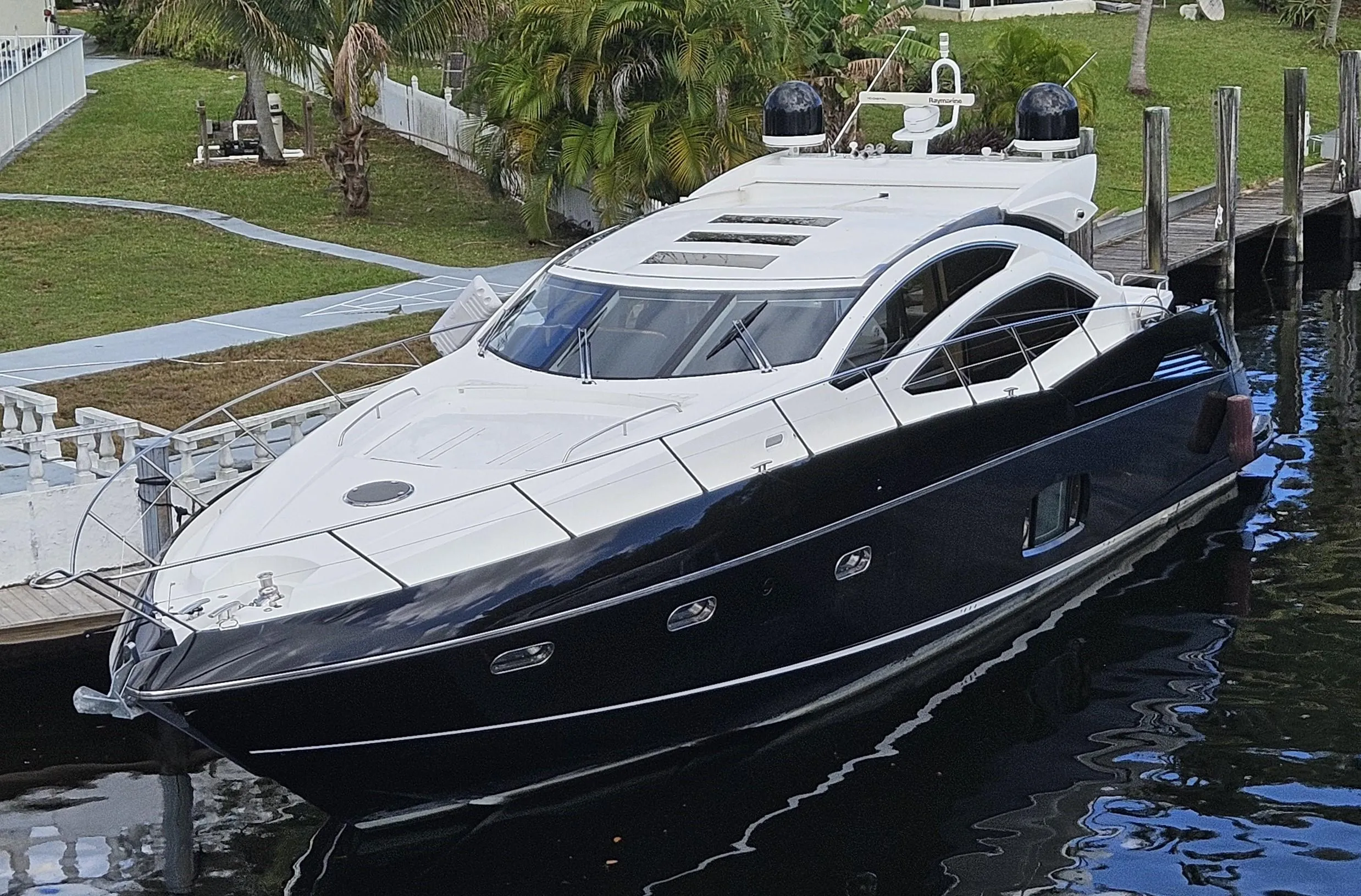 This 64 Predator features a walnut interior and has a 3 stateroom, 2 head layout with a spacious full-beam master stateroom. Her lower galley and seating layout allow owners and guests to have a couple of different comfortable lounging areas to be present onboard. The large sliding glass doors and opening sunroof in the salon open up to the aft cockpit creating a large entertaining space. Walking aft you will find a hydraulic swim platform, tender garage, and a storage room. Ample foredeck seating on the bow with chaise lounges, give guests the opportunity to relax in the sun while at anchor or underway.