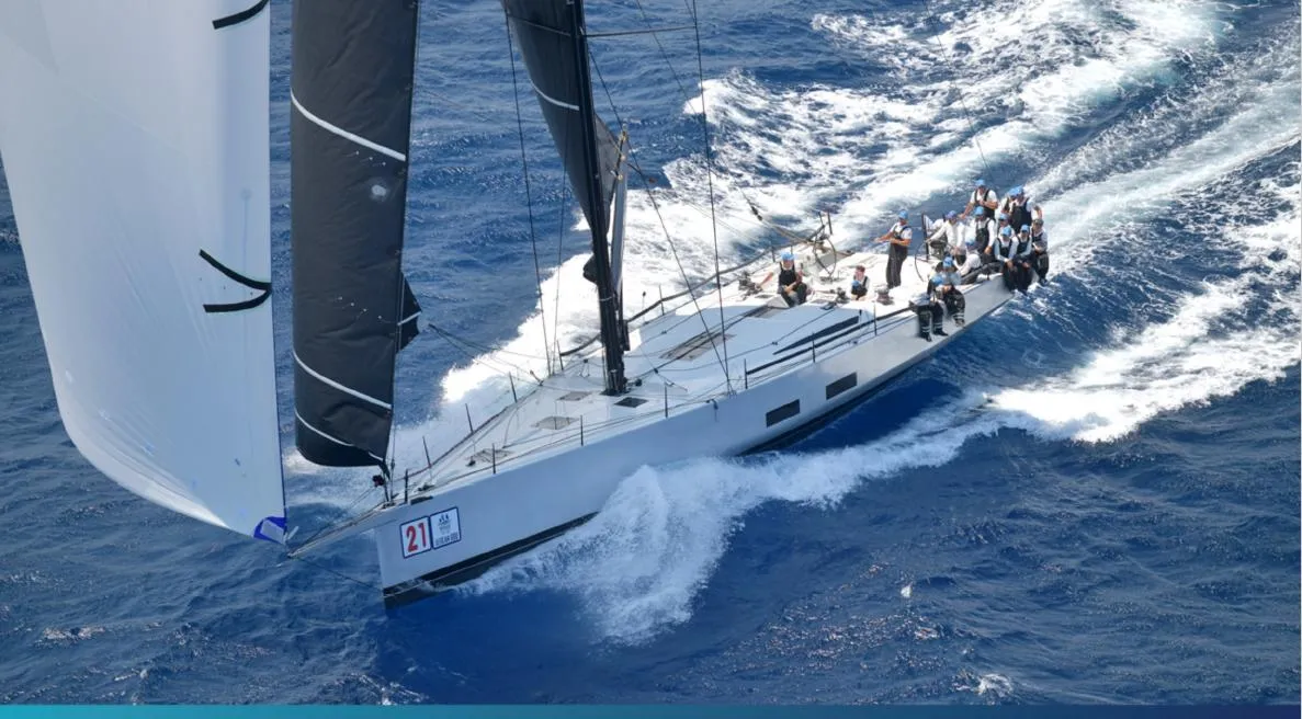 Sail Power: 230 sqm total sail area featuring an extensive North Sails 3di Raw inventory for upwind, reaching, and downwind legs.