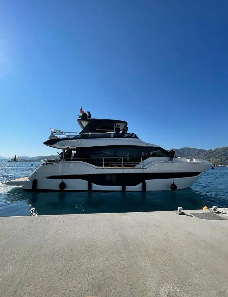 - Flybridge: large "C" sofa with storage space; bar cabinet with teak lid complete with fridge, grill, induction hob, sink, equipped drawers, trash area; two-seater pilot and co-pilot seats, with lockers. Aft handrail in steel and crystal with teak finish.