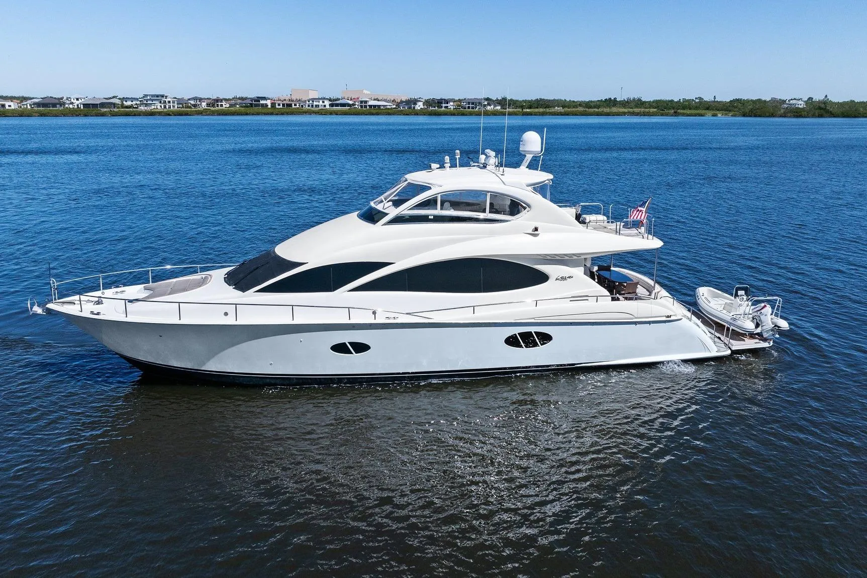 Lazzara is well known for its excellent boats, which provide a perfect layout and a great ride. This 2005 68 Lazzara is in fantastic shape and has a recently added TNT swim platform, making it 74' without losing the tender garage storage. She is powered by Caterpillar C18s with 3000 hours and has had the 3k hour service, including new after coolers. The seller has spared no expense with recent upgrades, including new Simrad electronics, new teak, Yacht Controller, recent stabilizer service, as well as new headliners and whisper walls just to name a few. She is easy to see at Riviera Dunes Marina in Bradenton. Call the listing broker for more information or to schedule a showing.