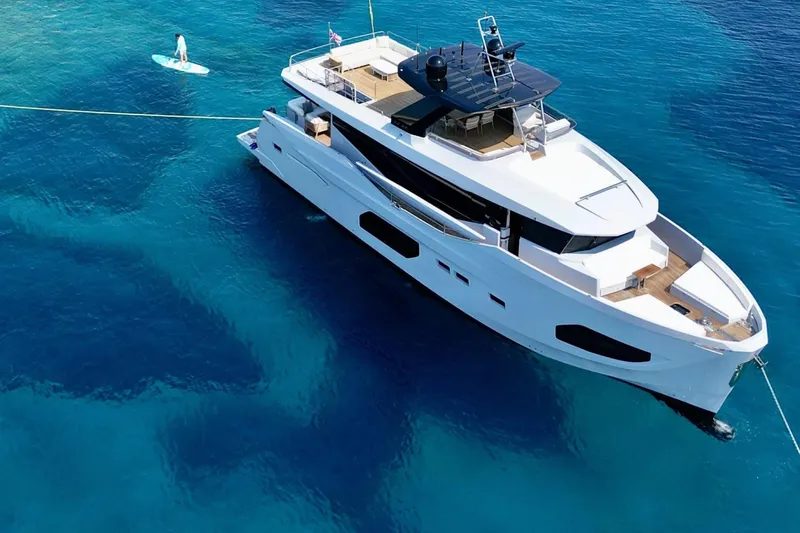 Owner's cabin with panoramic sea views and minimalist luxury is a full-beam sanctuary.