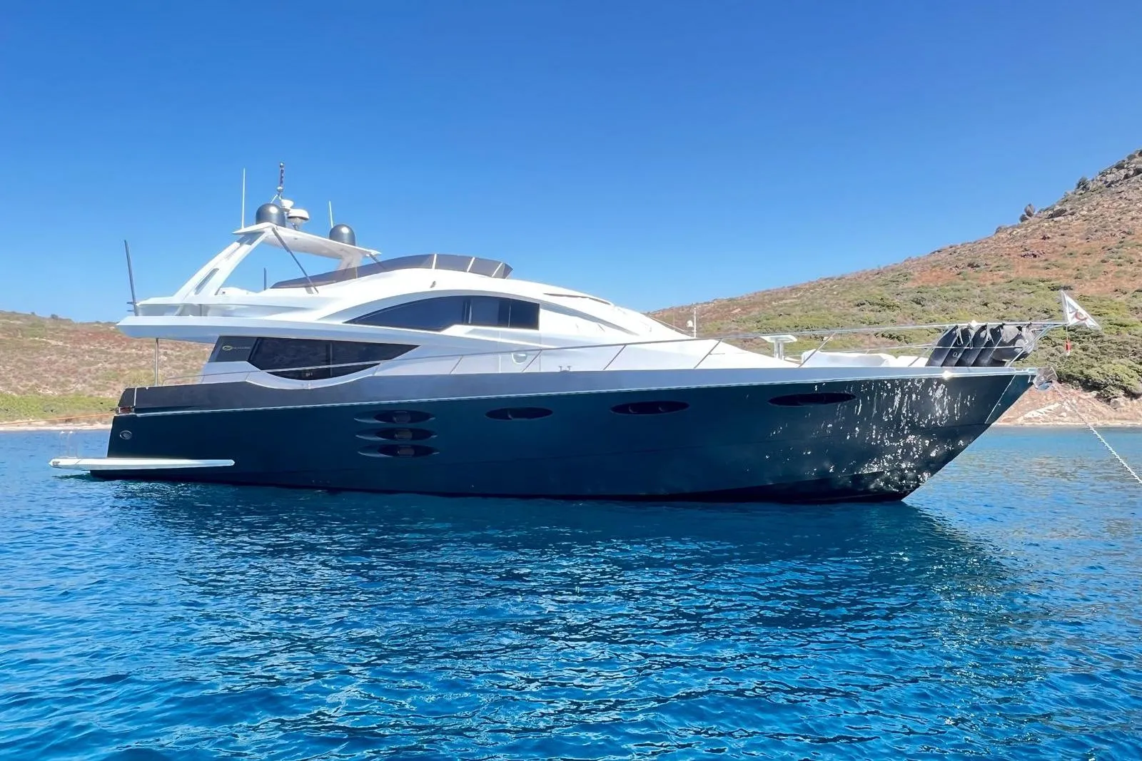 Introducing the stunning 2010 Numarine 78 Flybridge, a remarkable vessel that combines elegance with performance. With an impressive overall length of 23.98 meters, this yacht boasts a sleek fiberglass hull designed for both durability and aesthetic appeal. Powered by two robust Caterpillar inboard engines, each delivering 1050 hp, it promises exhilarating cruising experiences. With 2980 hours of operation, these engines have proven their reliability and strength, ensuring smooth navigation on the open waters. The Flybridge design enhances the onboard experience, providing ample space for relaxation and entertainment while enjoying panoramic views. This yacht is perfect for those seeking adventure and luxury, making it an ideal choice for both leisurely cruises and spirited voyages. The Numarine 78 is a true testament to fine craftsmanship and engineering, ready to elevate your boating experience to new heights.