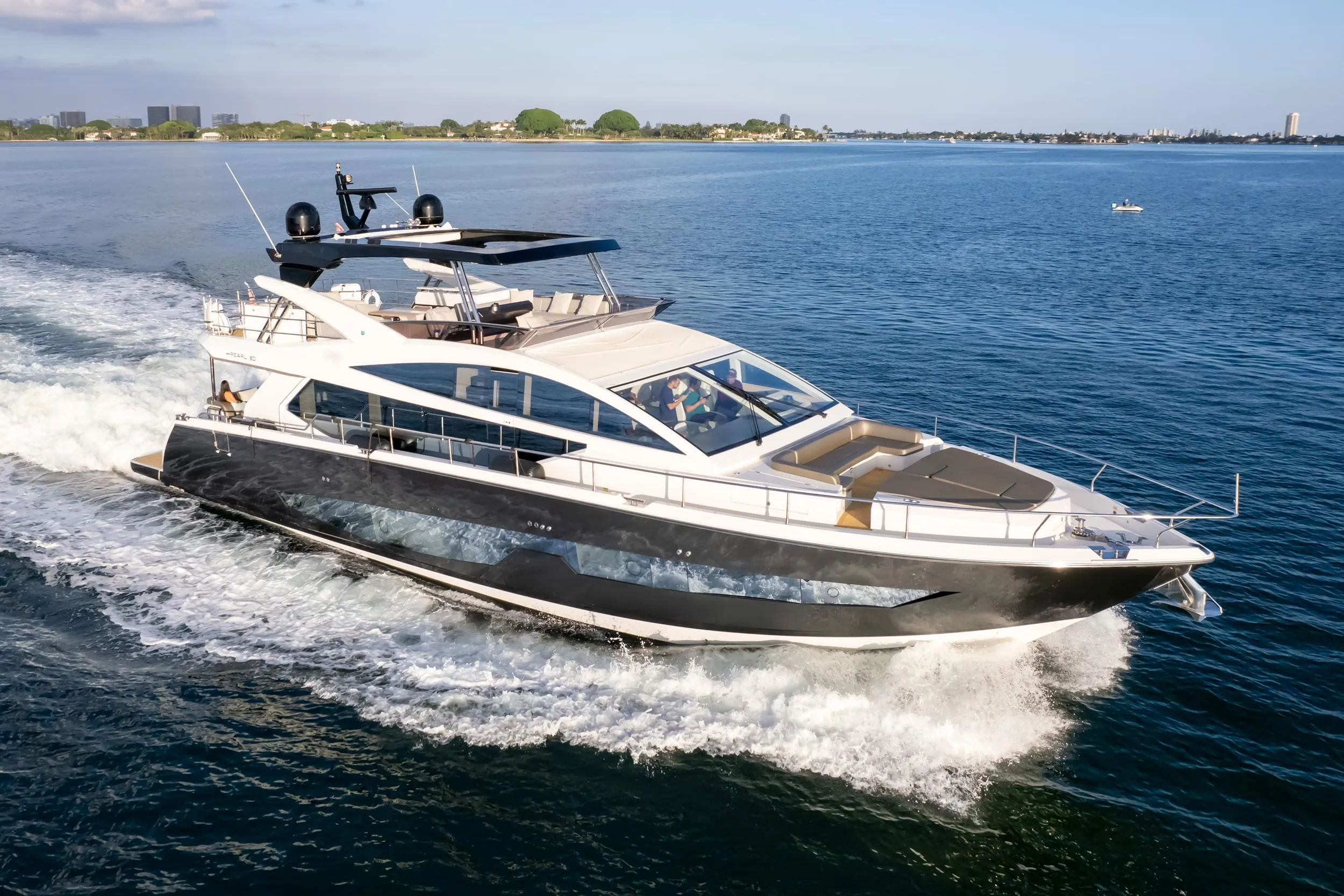 The Pearl 80 offers an escape that’s both exhilarating and unparalleled. From the beautifully streamlined exterior – complete with jet ski garage and hydraulic bathing platform – to the stunning open-plan interior designed by Kelly Hoppen MBE, every detail ensures that your life on the ocean is well and truly catered for.