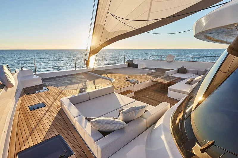 The bow section now benefits from a thoughtfully redesigned lounge space. Owners can choose between reshaped trampolines for a classic sailing feel or opt for luxurious sun pads to create a tranquil front terrace, perfectly shielded from sun and wind — tailored for any mood or moment.