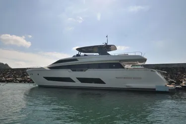 The 2017 Ferretti 850 is an 85-foot luxury flybridge yacht featuring a modern, open-concept interior inspired by a loft apartment, with bold performance and a focus on maximizing space. Key features include a full-beam KTV, 2 guest cabins, and a large transom door that lowers to create a beach club area with easy water access. The design incorporates elements like straight lines, large glazed surfaces, and freestanding furniture, with performance options including twin MAN engines capable of speeds up to 29 knots.