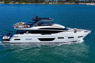 The all-new Y85 is a triumph of contemporary design. Her elegant sweeping profile houses an interior sanctuary that resets the benchmark for modern living. Her flybridge is an irresistible invitation to al fresco entertainment with a large dining area opposite a well-equipped wet bar further complemented by a large aft sunpad. With twin MAN V12 engines propelling her to a top speed of 33 knots, she flies past her contemporaries without looking back. An expansive single-level main deck provides ample entertaining space with a flexible galley arrangement. Three separate seating areas ensure the utmost privacy for guests with the crew able to move discretely around the yacht. Below deck, up to eight guests are accommodated across four beautifully appointed en suite cabins. Amidships, the full beam master suite is a champion of spacial design, whilst the en suite VIP cabin, forward, boasts a large double bed and walk-in-wardrobe. Furthermore, one double and one twin cabin (convertible into a double) complete her spacious accommodation. Unmissable, the all-new Y85 is unmistakably Princess.