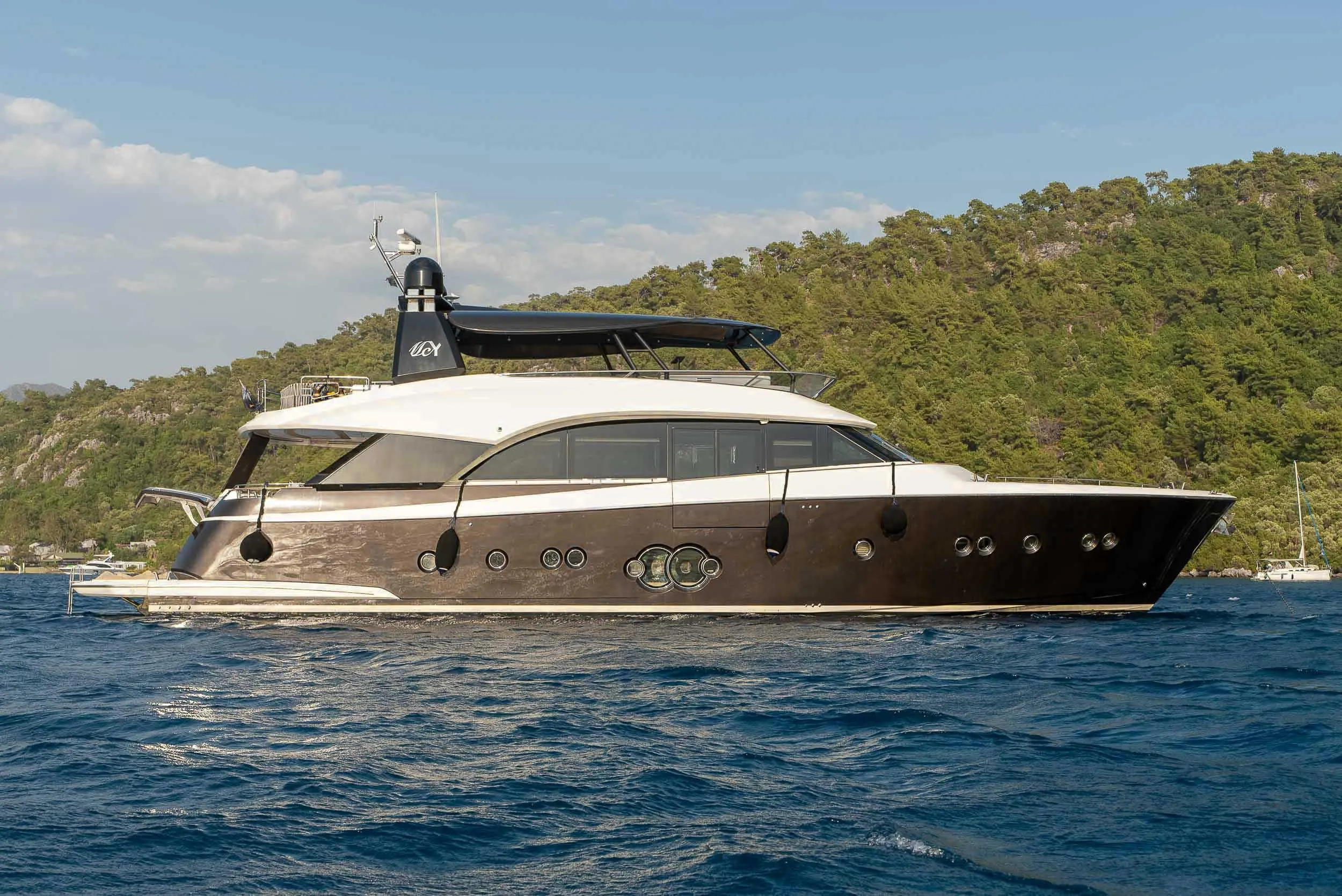 The Monte Carlo Yachts MCY 86 is a 26.3-meter luxury yacht that exemplifies the brand’s commitment to combining elegant design with advanced technology. Its exterior features a distinctive Portuguese deck leading to a private sea lounge, offering versatile spaces for relaxation and dining. The interior showcases high-quality materials such as white alabaster from Volterra, cedarstone marbles, moka cream limestone, and handcrafted Venetian Murano glass mosaics, with furnishings from renowned fashion houses like Hermès, Armani, Poltrona Frau, and Pierre Frey.