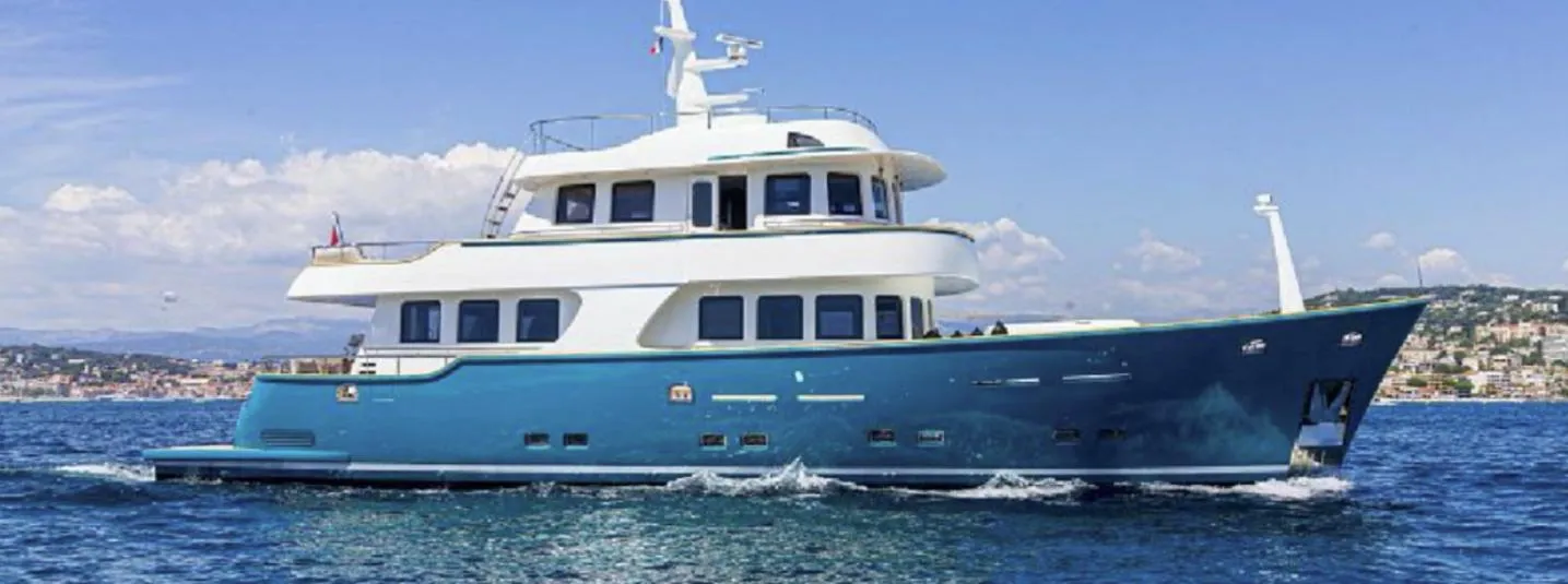 ''The Terranova T85 Yacht is a beautiful motor yacht with a timeless style. She can accommodate 8 guests in 4cabins all ensuite including a superb full beam master cabin, a VIP, two twin cabins and a laundry room. The dining room offers a panoramic view. With one saloon on main deck and one on upper deck, this Terranova offers large volumes to enjoy with friends and family. Huge bow tender area for 2 large tenders and toys.