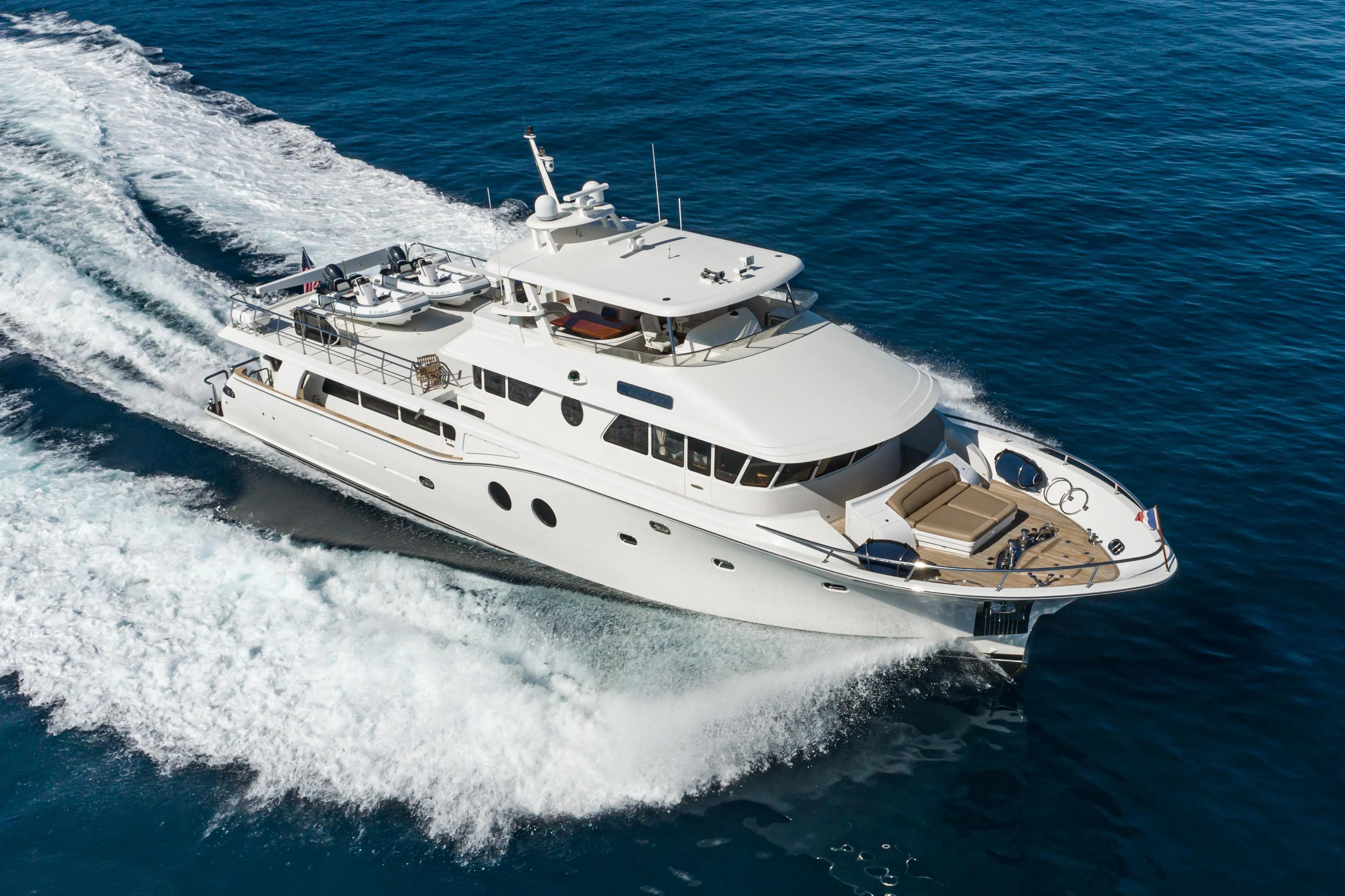 - Notable 28x19ft sundeck that doubles as an entertainment area and stowage of toys, tenders, or even a collapsible wing seaplane or lightweight helicopter.