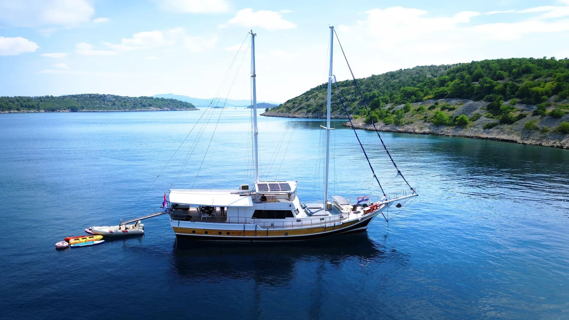 The spacious foredeck has cushioned sunbeds and a seating area with cocktail tables. Sirena also provides a sailing system, a 5.50 metre tender with 100 HP outboard. Plus, a variety of water toys for your pleasure, including banana, ringo, SUP, kayak and fishing equipment. Sirena is a top choice, offering great value, with all her up to date facilities and great levels of service, from the crew of 4 attentive personnel. For groups or couples, wishing to charter a gulet in the Adriatic region. Sirena is a perfect choice to ensure you and your guests have a magical gulet cruise, along Croatia coastline and islands.