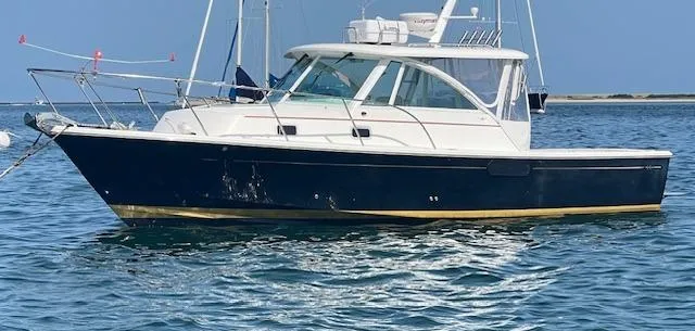 The Hunt Yachts Surfhunter 29 is designed by C. Raymond Hunt and Associates for superior handling characteristics below the waterline and timeless beauty above. She easily gobbles up sporty seas from Buzzards Bay to Hatteras. Her thoughtful interior arrangement affords ample room for a weekend here and there and her pilothouse is thoughtfully laid out as well. This example has the coveted (and optional) Volvo diesel for long life, fuel economy and reliability.