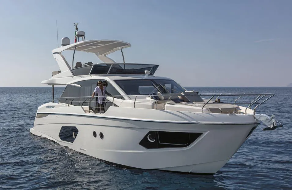 The Absolute 50 Flybridge, known as the "Absolute Achievement," balances size and functionality for guest comfort. With elegant combinations of colors and materials, this yacht is dynamic and innovative. Its expansive, unobstructed windows enhance the view. The aft cockpit, connected to the kitchen, converts into a sunbed. The flybridge, one of the largest in its class, features a table, sofa, full kitchen, dual-seat helm, and sunbed. Contact us today for more information and book your experience on the 50 FLY!