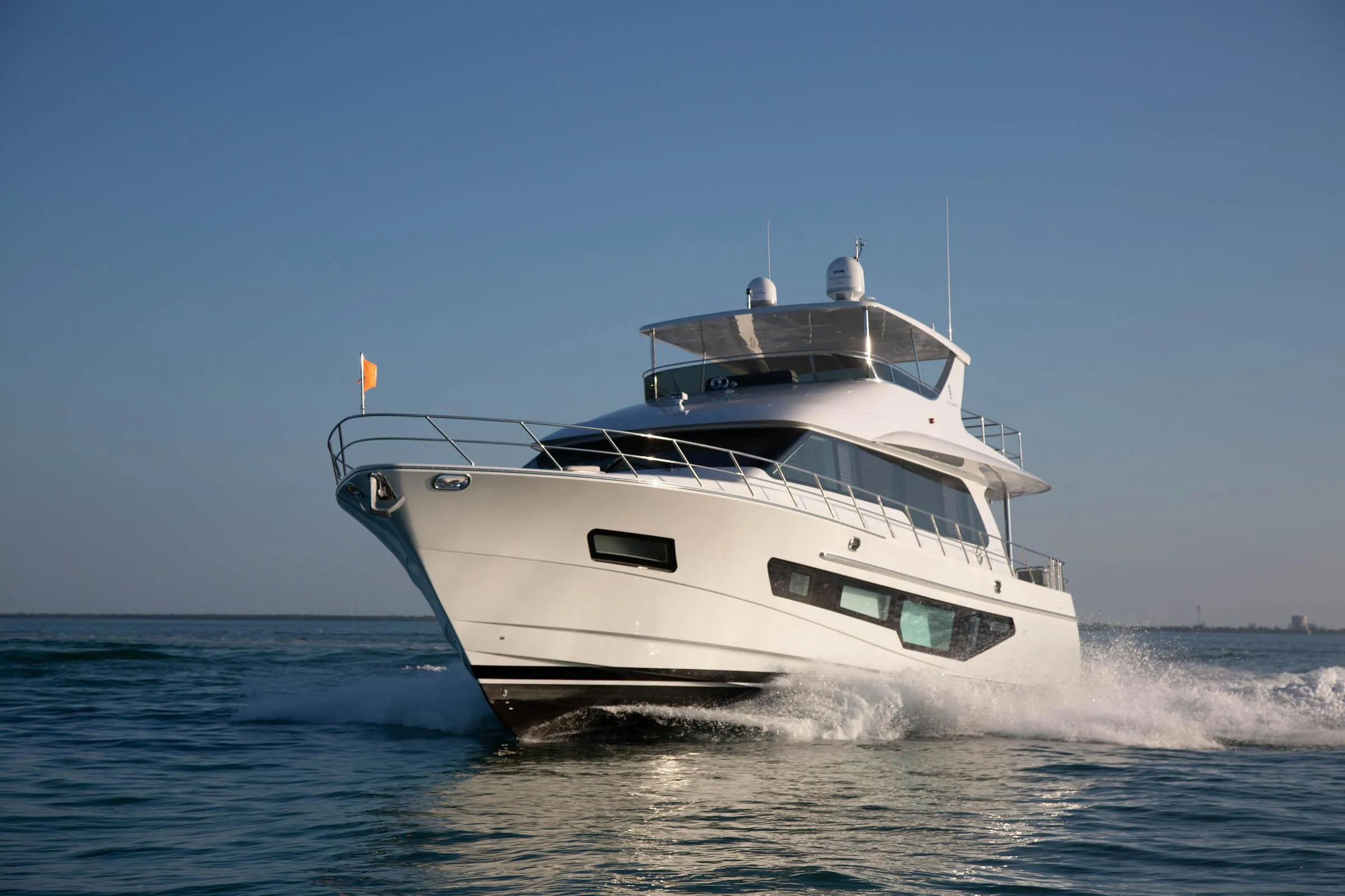 Salon Stainless steel electric glass sliding door Tinted glass windows Recess in window boxes with shades Combined smoke/CO detector Entertainment cabinet, 55” TV on lift, home entertainment system and Wi-Fi antenna (Full AV list provided upon request) Upholstered settee and chairs Cocktail table Ceiling lights with dimmer control/switch Valance and floor lighting Wall sconces USB power outlets HDMI socket 110vAC outlets Flybridge Hardtop integral with radar arch. Flush mounted overhead lights with dimmer control/switch VOLVO electronic engine controls with joystick Engine instrumentation and alarms Fiberglass instrument and electronic console RITCHIE compass Remote control for anchor windlass and searchlight Stainless steel monogrammed steering wheel Acrylic windscreen Stainless steel rails aft Two STIDD helm seats Stereo and speakers Fiberglass seats with storage Painted composite fiberglass table Non-skid deck Scuppers and drainage system for water to boot top Lightning arrester system Stairs to aft deck, with teak treads and stainless steel rail/gate Fiberglass locker with refrigerator, electric barbeque grill and fresh water wash down hose bib USB power outlets 110vAC GFI outlets ACR 100 quartz halogen search light Galley & Dinette BOSCH 30” oven BOSCH microwave/vent hood BOSCH Monogram 30” induction cooktop BOSCH dishwasher SUBZERO 36” refrigerator drawers x2 SUBZERO 30” freezer drawers x2 SUBZERO wine cooler & glass locker Synthetic stone sink Faucet Garbage disposal Black Fenix Nano Technology self healing counter top Galley island (Fenix NTM) Dinette with upgraded marble dining table Plate and glass storage Combined smoke/CO detector Under cabinet lights with switch USB power outlets 110vAC GFI outlets Ceiling lights with switch Staterooms & Heads Please contact for full list of standard and upgraded AV and NAV specifications. DAY Head in SalonLarge windowPedestal sinkSingle handle faucetCeiling lights with switchTECMA electric head (fresh water flush)Exhaust blower110vAC GFI outlet MASTER STATEROOMKing berth with storage drawers underTinted glass hull side windowsWood floor, satin finishElectric window shadesOver the berth soffit with indirect lightingNight tablesSmart glass for head wall and closet doorMake-up table and lighted mirrorSamsung 55” TV Starboard drawers and cabinetCombined smoke/CO detectorWalk-in closet, cedar linedCeiling lights with dimmer control/switchValance and floor lights with switchReading lights with switchesUSB power outletsHDMI socket110vAC outletsEmergency access door to crew area24” Washer/dryer in passage to master stateroom MASTER HEADStone floorCeiling lights with switchTECMA electric head (fresh water flush)Stone stall showerRain shower head, hand held head plus benchSynthetic stone counter top and backsplash with double sinkVanity mirror with LED lights110vAC GFI outlet in head FORWARD VIPCustom queen berth with storage drawers underCarpeted floorCombined smoke/CO detectorWardrobe, cedar linedFixed hull side windowsElectric window shadesCeiling lights with switchValance and floor lights with switchReading lights with switchesForedeck hatch dual screens40” TV and sound barUSB power outletsHDMI socket110vAC outlets VIP HEADStone floorsCeiling lights with switchTECMA electric head (fresh water flush)Stone counter top and backsplashPorcelain sinkStone stall shower110vAC GFI outlet PORT GUEST STATEROOMTwin berths with storage drawers under - converts to fullCarpeted floorCombined smoke/CO detectorWardrobe, cedar linedCeiling lights with switchValance and floor lights with switchReading lights with switchesFixed hull side window with shade28” TV and sound barUSB power outletsHDMI socket110vAC outlets GUEST HEADStone floorsCeiling lights with switchTECMA electric head (fresh water flush)Stone counter top and backsplashPorcelain sinkStone shower stall with doorFixed portlight with shade110vAC GFI outlet STARBOARD GUEST STATEROOMUpper and lower single berthCustom folding teak ladder for upper berthCarpeted floorCombined smoke/CO detectorWardrobe, cedar linedCeiling lights with switchValance and floor lights with switchReading lights with switchesFixed hull side window with shade28” TV and sound barUSB power outletsHDMI socket110vAC outlets CREW STATEROOMUpper and lower single berths with storage drawers underStairs and weathertight pantograph door to port side deckWood floor, satin finish27” TV and sound barCombined smoke/CO detectorWardrobe, cedar linedCeiling lights with switchReading light with switchFixed portlight with shadeEscape hatch to master stateroomUSB power outletsHDMI socket110vAC outlets CREW HEADWood floor, satin finishCeiling lights with switchTECMA electric head (fresh water flush)Counter top and backsplashFiberglass shower stallFixed portlight with shade110vAC GFI outlet Pilothouse VOLVO electronic engine controls with joystick Engine instrumentation Instrument and electronic console RITCHIE compass STIDD helm seat Remote generator control panel Remote control for anchor windlass and searchlight Stainless steel monogrammed steering wheel USB & 110vAC outlets Windshield wipers with fresh water wash Defroster for windscreen glass Electronic window blinds on forward windows Weather tight fiberglass pantograph door to starboard side deck Ceiling lights with dimmer control Red night lights with switch Aft Deck & Swim Platform AFT DECK SUBZERO under counter refrigerator and storage with granite counter top Molded stairs to flybridge with teak treads, storage under Teak decking Wet bar with upgraded granite tops, sink with hot, cold water faucet and icemaker Two custom swivel stools at wetbar Teak sliding table 32" television Integral steps to swim platform with teak decking, stainless steel handrail and step lights Joystick docking station Overhead lights with switch Port and starboard boarding gates with fiberglass doors 110vAC GFI outletSWIM PLATFORM Teak decking Sliding tender chocks which are removable Transom show