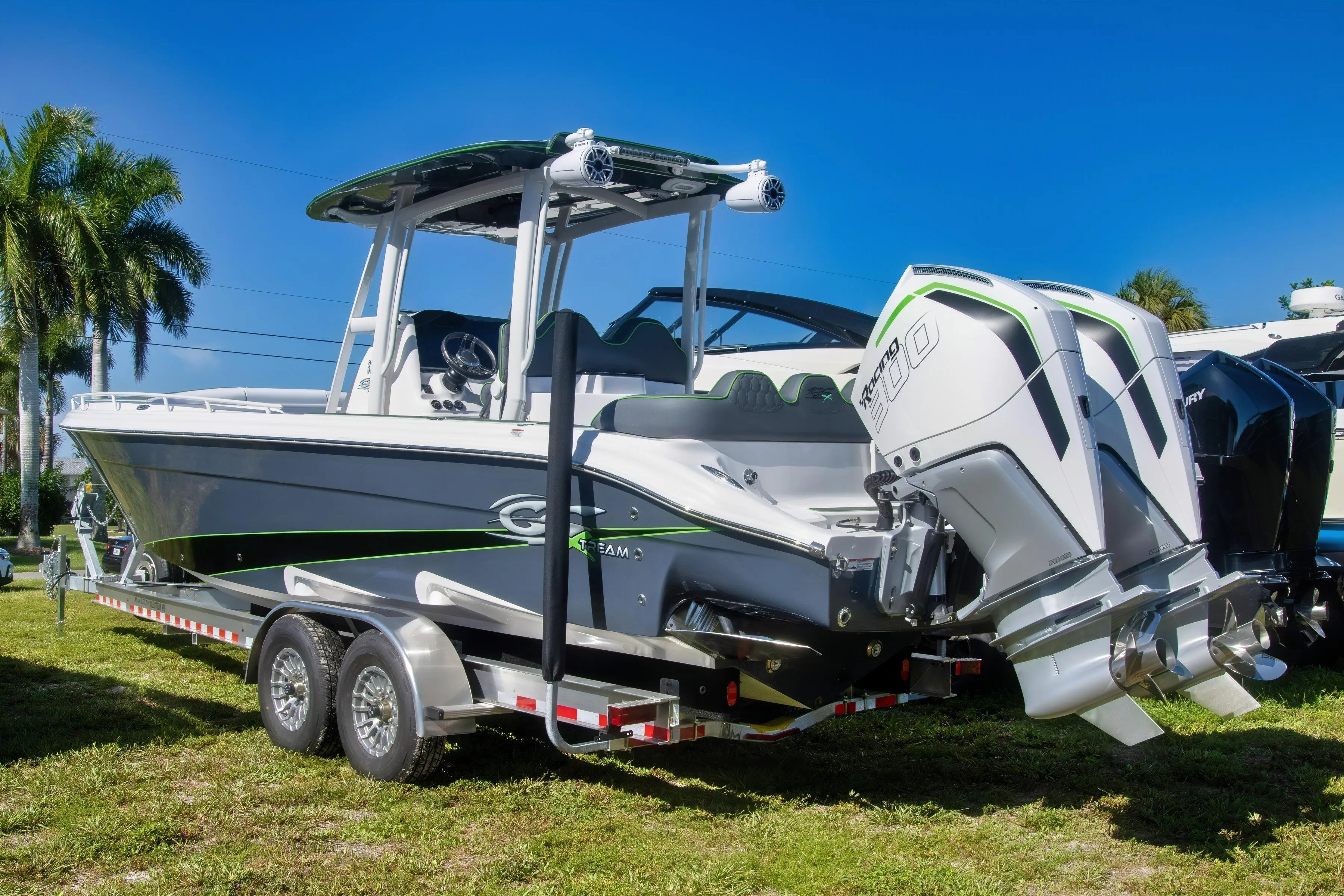 This boat is loaded with options. The cabin has AC and a TV. The boat has got a JBL sound system. There are lights pretty much everywhere, they all change color and can dance to the music (even under the boat). Dual Garmin MFD's with a go light on the custom T-Top.