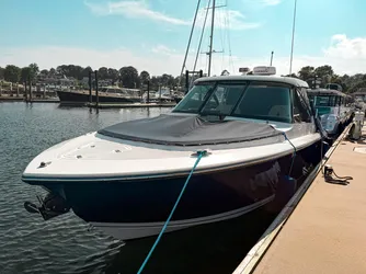 The DC 325 combines central utility, a starboard side helm center and tremendous seating functionality with exquisite Pursuit appointments. The DC 325 features an open bow design with full wrap-around seating, plenty of storage and a unique ladder system forward designed for exiting the boat straight to your own private beach. The fully integrated fiberglass hardtop with visor is engineered with a tempered glass windshield system, composite frame forward and bonded to the fiberglass hardtop. Port and starboard glass is fixed in a white, powder-coated aluminum frame complete with recessed enclosure track. The port side wrap-around lounge, double-wide helm seat, cockpit seating and forward bow seating offer plenty of available spaces to satisfy everyone’s favorite spots to ride along or run the DC 325. The dual consoles open to reveal port-side dedicated equipment storage and lounging area along with a starboard side head accessed via innovative, dual action door systems.