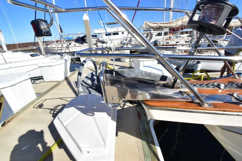 · Patented SeaSafe anchor rollers on bow platform; primary anchor is a 44 lb. Rocna anchor shackled to 225 feet of 5/16” G4 high test chain spliced to a safety tail of 10’ of 9/16” 3 strand nylon anchor rode with bitter end secured in chain locker
