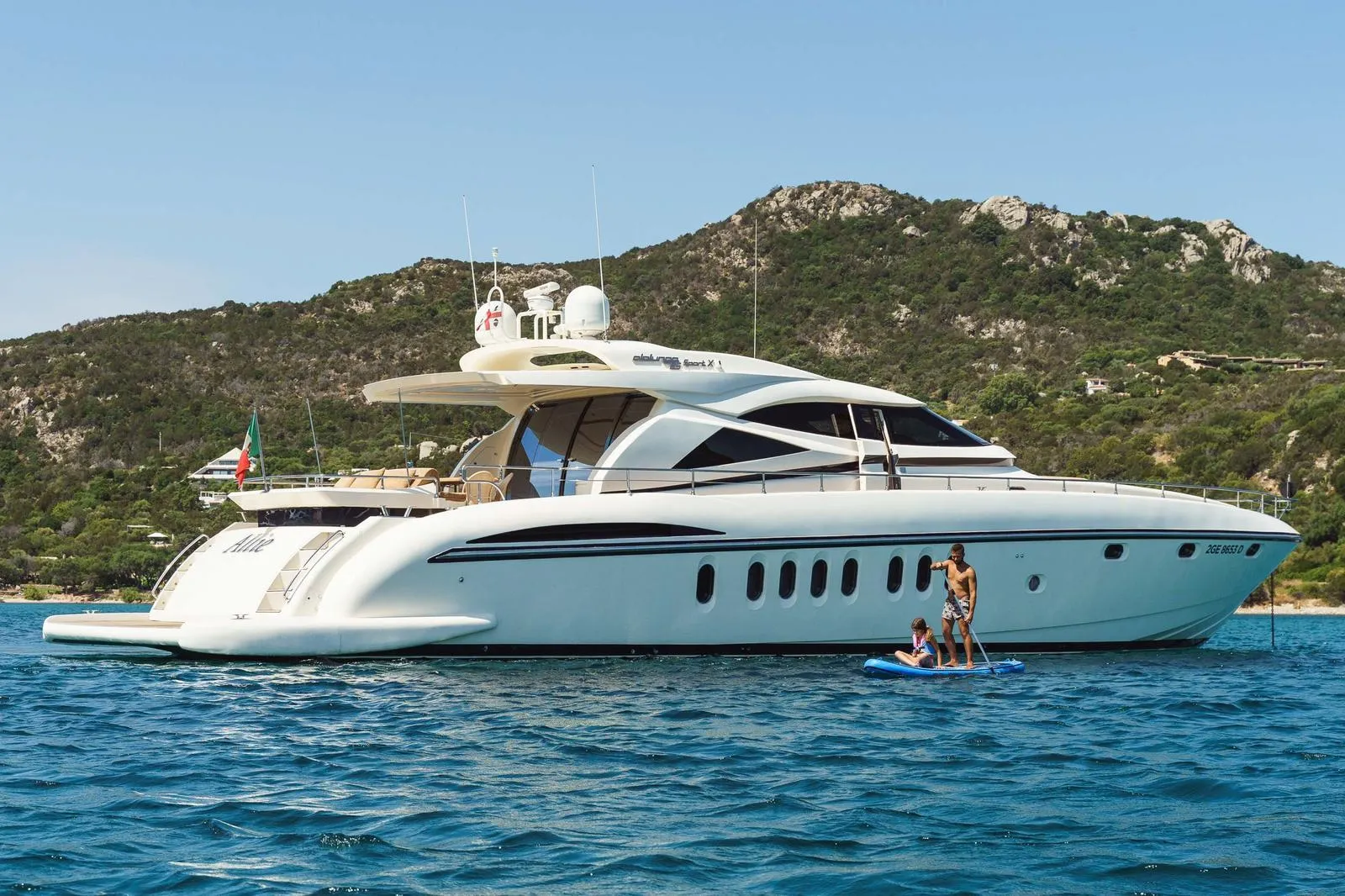 ALLIE – Alalunga 85X SPORT is the epitome of sporty elegance and refined luxury. Her sleek design is matched by a crème-de-la-crème interior, where every cabin boasts its own en-suite bathroom, offering privacy and comfort for all guests on board.
