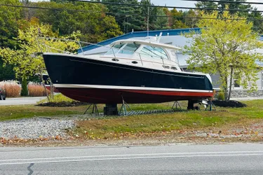 Powered by the twin Mercury V8 Verado 300hp with JPO system (joystick piloting). This lightly owned 34O is nicely equipped with low hours, stored inside winter storage building during off-season, has the Garmin electronics package, a custom helm deck - window canvas package, bow thruster, Flag Blue hull and more.
