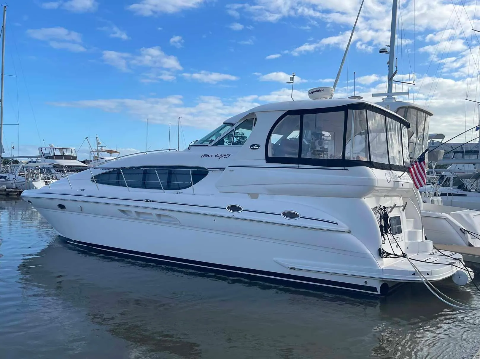 The 480 Sea Ray Motor Yacht has long been the most popular Motor Yacht that Sea Ray ever designed and built! 3 Staterooms, 2 heads each with separate stall shower, large galley, huge salon, full beam master and fully enclosed helm and aft deck area combine to make this one of the most comfortable cruising platforms anywhere.
