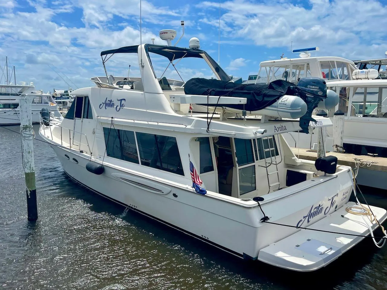 Anita Jo is powered by twin 330-hp Cummins diesel engines with only 645 hours. A Cummins generator provides offshore electrical power and a reverse cycle HVAC system maintains interior comfort. This Meridian 490 Pilothouse is well equipped, professionally maintained, and ready to cruise in style. Call now for more information and to schedule a showing.