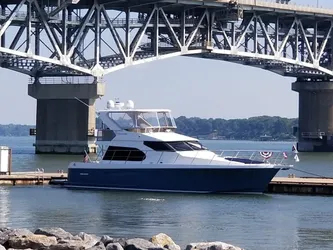 Ocean Alexander 52 Sedan, Apaiser, is a 52-foot sedan-style cruiser with a flybridge and features a European-style exterior, clean lines, and a versatile layout including a large cockpit and a Eurostyle reverse transom with a hydraulic swim platform. She exudes a Classic European-style exterior with clean lines and a sculptural flybridge canopy.