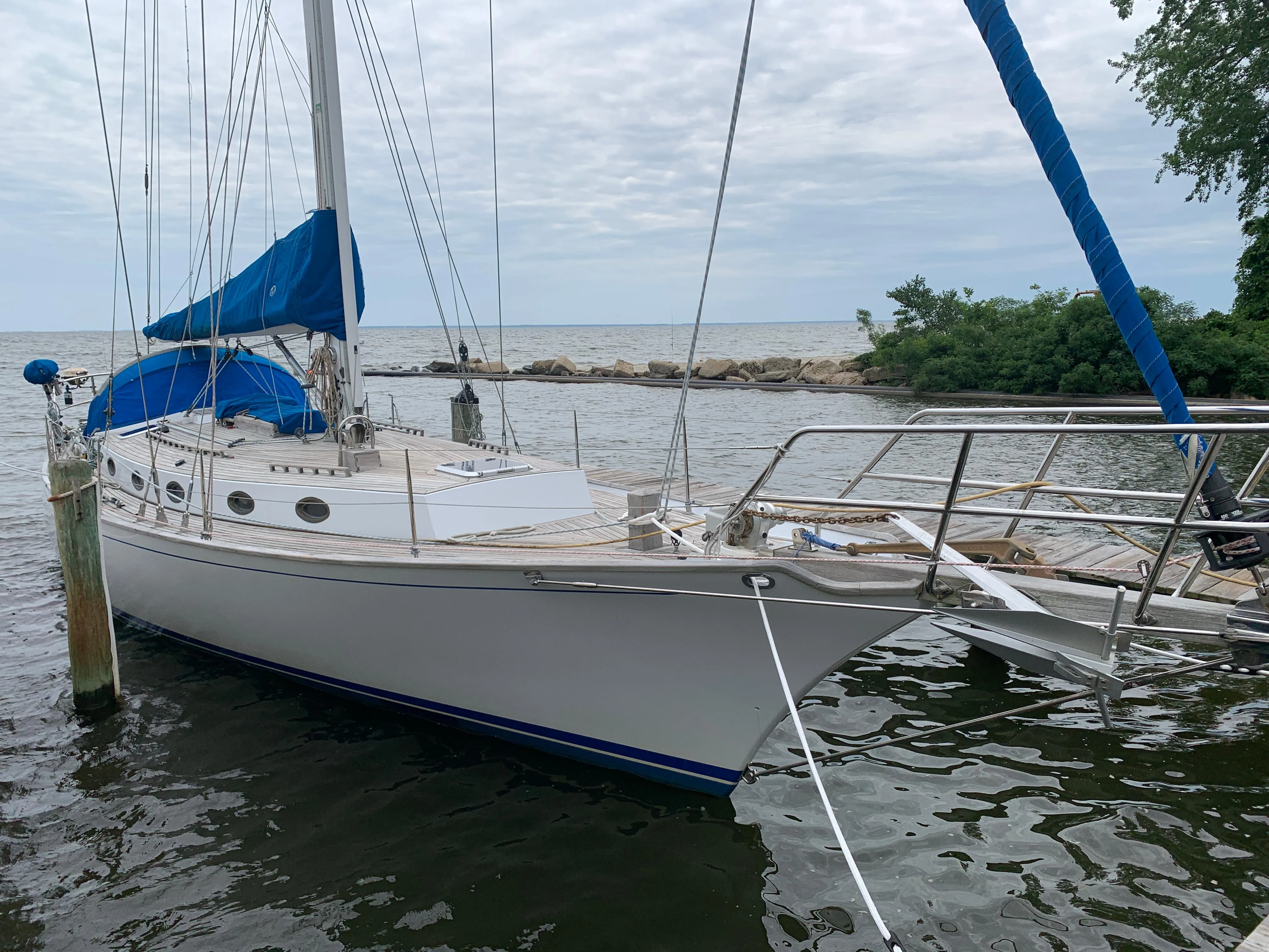 Her spacious cockpit allows for safe and secure navigation in all conditions. The robust 1.5" stainless pushpin and pulpit are oversized and extremely sturdy. Her TEAK DECKS are immaculate, with considerable thickness and they are GLUED DOWN, NOT SCREWED!! So, there is no concern for the condition of the underlying deck core. The bulwarks are high thus providing for sure-footed movement forward in all conditions.