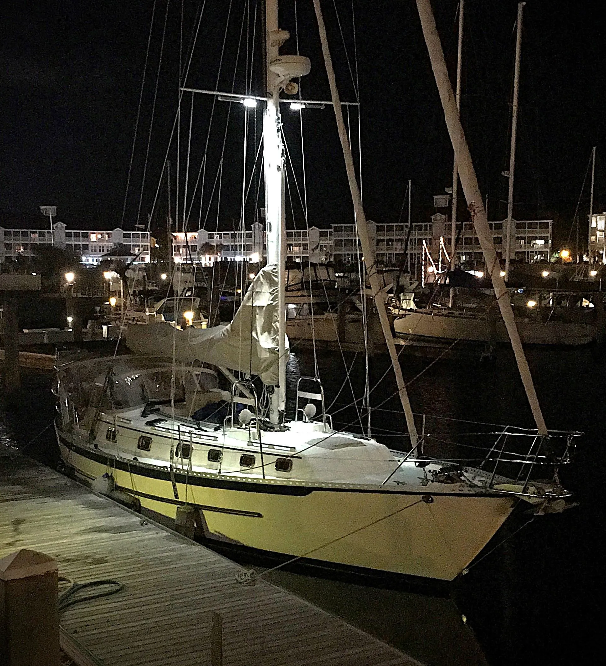 Galley - Gimbaled s.s. three burner propane stove w-oven & broiler. - Safety bar. Formica stove top. Locker over refrigerator. - 10 cu. ft. ice box w-foam insulation, hinged lid & manual pump out to sink. - Polished s.s. double sink with electric pump pressure fresh water & foot operated manual pump. - Food & dish storage lockers & drawers. Tilt-out trash bin. Aft Stateroom - Enclosed aft stateroom with 6' 9" long and 54" wide double berth. - Teak privacy door separating aft stateroom from main salon. - Large cedar-lined hanging locker. Drawers under berth. - Vanity mirror on bulkhead. Teak ceilings above shelf. Plumbing - Three water tanks w-inspection ports, approx. 150 gallons (589.5 liters). - Hot & cold pressure fresh water system for galley, head & shower with accumulator tank & foot pump in head & galley - Easy access fresh water manifold. Color coded water hoses. - 6 gallon hot water heater from engine heat exchanger or shore power. - Bronze thru-hull fittings with UL approved bronze seacocks below the waterline & bronze ball valves above waterline; all double clamped. - Marine head with 19 gal. holding tank, macerator, & overboard pumpout. - Electric shower sump pump with overboard discharge. - 11 GPM electric automatic bilge pump with Ultra pump switch. - 25 GPM manual bilge pump in cockpit operable by helmsman. Engine - Yanmar 4JH2E, four cylinder, 51 hp (36.8 kW) diesel w- fresh water cooling. - 3" exhaust, electric stop, & 80 amp alternator. Yanmar "C" control panel. - Clear covered engine control panel in cockpit by helm with tachometer, engine hour meter & engine condition indicators. - Removable aluminum fuel tank approximately 70 gallons (265 liters) with gauge & cleaning port. Three-blade solid bronze propeller. - Mechanical fuel pump, electric back up fuel pump. Racor MA500 fuel filter. - Seawater strainer bulkhead mounted & water lift muffler system. Electrical - AC-DC master power control panel with AC ammeter, AC voltmeter, DC ammeter, DC voltmeter, polarity test circuit, 8 AC circuit breakers, 12 spare AC switches, battery condition monitor, 20 DC circuit breakers, 4 spare DC switches. Clear plastic screen. - Tinned copper wiring throughout. 110 Volt shore power system w- breaker. - Three Lifeline advanced absorbent glass mat sealed deep cycle marine batteries (105 amp-hrs.) under cabin sole. - One 4 position battery switch. Two fluorescent lights in main salon. - Cantalupi lights (nine dome & seven reading). - Chart light at navigation station. Dome light in engine & cockpit locker. - AC duplex receptacles with polished covers & GFI protection for 11OV. - VHF coaxial antenna cable led from masthead to navigators table. Cockpit - 7' long seats with contoured seat backs & seat drains. - Coamings have two built-in winch handle boxes, one is for shower. - Cockpit seat lockers for storage. Chrome opening portlight starboard. - Lazarette hatch & vented propane locker for two 5 gallon tanks. - One 5 gallon propane tank (empty) with s.s. mount. Copper LPG hose. - Two safety harness pad eyes in cockpit. - Whitlock Cobra pedestal wheel steering with brake & offset stainless steel pedestal guard, single lever engine control & emergency tiller. - Removable cockpit sole w-neoprene gasket seal, finger pulls, & four chrome retainers for access to engine, steering & packing gland. - Deep gutters & two 1-1-2" cockpit drains for fast self-bailing. Spars and Rigging - Custom aluminum spars with white two part linear polyurethane paint.