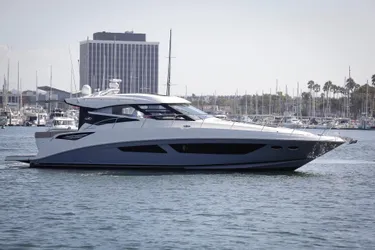 The 2016 Sea Ray 470 Sundancer is a 47-foot luxury express cruiser with a beam of 14 feet and a fiberglass Deep Vee hull. It is powered by twin Cummins Zeus QSB 6.7 diesel engines, each producing 473 horsepower, for a total of 946 hp. Key features include a hydraulic swim platform, an open-layout galley, two cabins with two heads, and a host of electronics such as a Raymarine chartplotter and joystick docking.