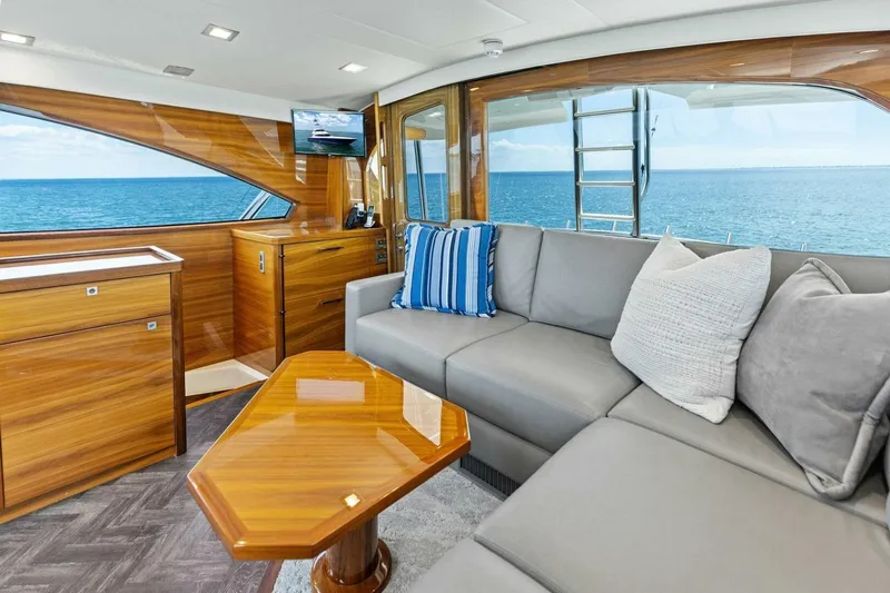 “Backlash” is a 4 stateroom 3 head layout with an island queen forward, King master stateroom, a single extra wide raised berth in port stateroom, and a custom crossover twin bunk set up in the Crew. Salon has an L shaped sofa, day head, and stairway to Enclosed bridge. Galley is open, with extended waterfall edged and lighted counter and Release Dubliner bar stools. Timber is high gloss, horizontal grain walnut with Ebony inlayed stateroom doors. All interior cabinet hardware & overhead lighting is brushed nickel with brushed nickel head hardware and chrome shower fixtures and hinges. Flooring is a combination of Amtico vinyl and carpet. Enclosed bridge is all Amtico with carpet on the raised platform area. All bedding, pillows, fabrics and Décor are “Prestige” level with designer artwork and accessories. All mattresses are innerspring Viking slumber #6 or 8 depending on placement.