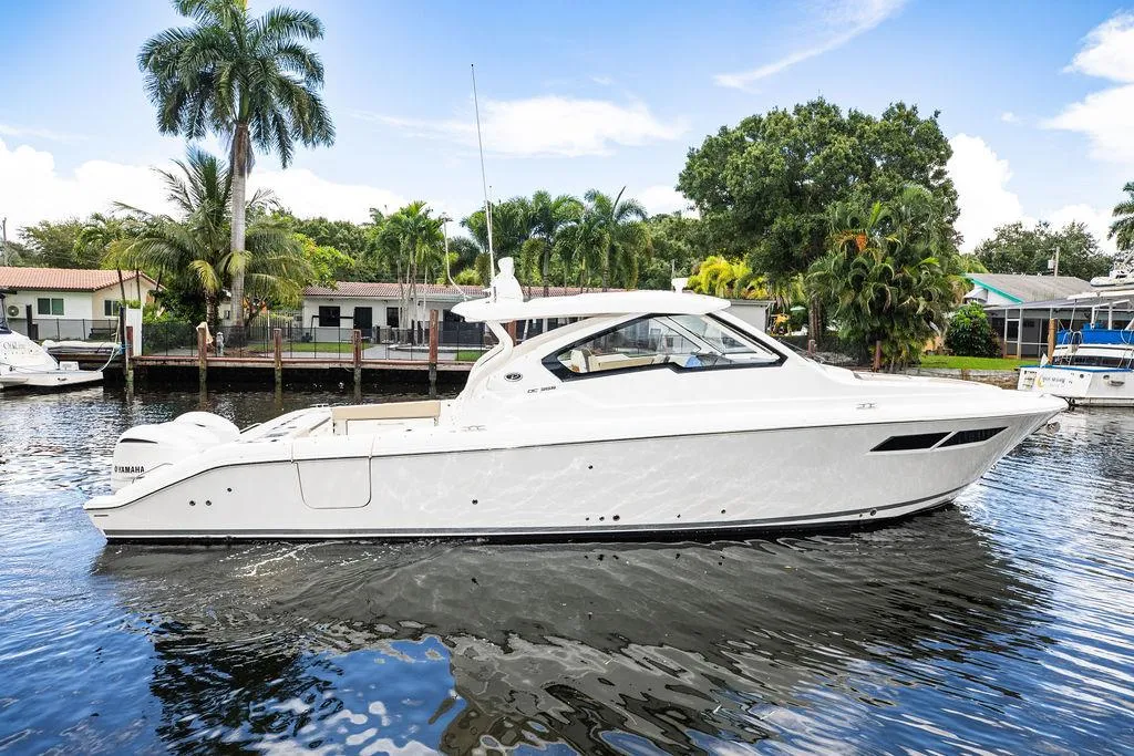 The stylish dual console boat line that has been perfected by Pursuit includes the DC 365. More comfort, innovation and features have been engineered to bring your sport utility experience to the next level. Forward bow and port side lounge seating, a swivel seat at the helm and patent-pending fold-away seating at the transom and under the gunwale give your crew a comfortable place to enjoy whatever type of water activities you choose. Features include a large tempered glass windshield with walkthrough, wide walkways from bow to stern and plenty of large storage compartments. Instrumentation and controls at the helm are ergonomically engineered and an optional Garmin electronics suite makes the DC 365 a joy to operate. Has an easily accessible cabin with a fiberglass door and features solid wood accents with modern finishes, a full berth forward and a comfortable aft berth. A small family or couple may overnight with basic amenities for the weekend. Hull side windows reveal plenty of natural light below. Foldaway seating quickly transforms a social venue to a wide-open, fish-ready cockpit with hull side door, livewell, gunwale mounted rod holders and insulated fish-boxes in the floor. The DC 365 dual console boat can do it all with room to spare and style that is Pure. Powered by Triple White Yamaha 300 motors.