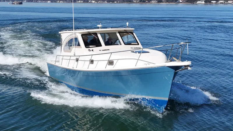 The Mainship 34 Pilot is an enlarged version of the super popular Mainship 30 Pilot, a versatile (and affordable) Down East cruiser introduced by Mainship in 1998. Where the 30 Pilot is essentially a day boat, the larger interior of the 34 provides the volume required for extended cruising. The first 34 Pilots were express models; in 2001, the Sedan version with an extended hardtop offered owners the added security of a semi-enclosed pilothouse. The well-appointed accommodations consist a roomy main salon with full-service galley and convertible dinette, enclosed head with shower, and a single stateroom forward with bi-fold privacy door. A TV on a swivel platform is mounted forward in the cabin. In the cockpit, facing bench seats behind the helm and companion seats can double as extra berths. A centerline hatch in the cockpit sole provides access to the engine. Additional features include a standard bow thruster, tilt-away helm, transom door, and wide side decks. The 34 rides on a semi-displacement hull with moderate beam and a deep keel. A single 350hp Yanmar diesel will cruise at 14 knots (16–18 top). Twin 240hp Yanmar diesels cruise at 18 knots.