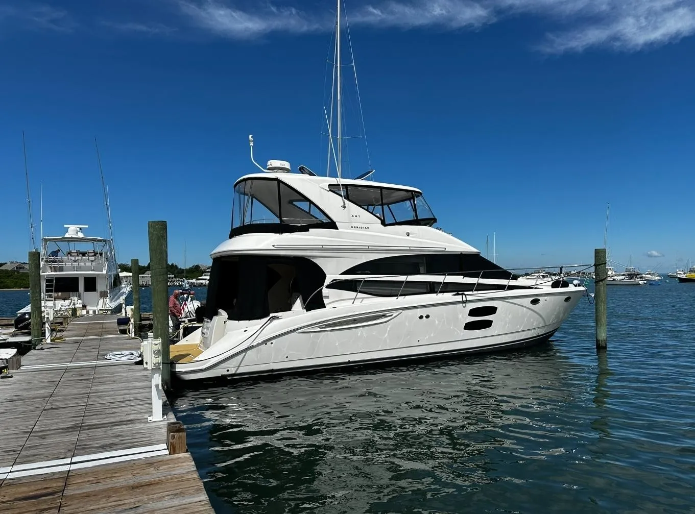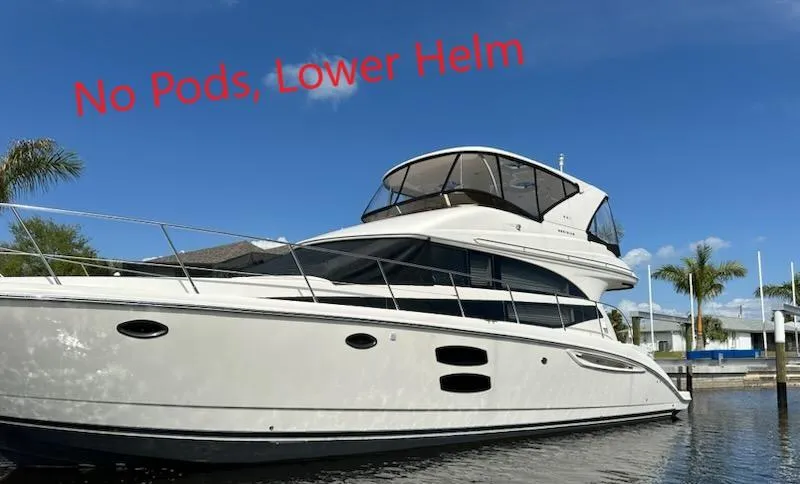 Look no further your dream boat is here!   A Meridian 441 with NO PODS and a LOWER station!   Thats right the 1st owner ordered this one with a lower station.   This is a two-owner boat, and it shows.   The current owner purchased 2 seasons ago and has completely gone through the vessel; New enclosure on the bridge, full carpet removal and installed high end plank flooring, in the cockpit and bridge is all sea Dek along with the swim platform.   All the counter tops were removed and replaced with high end Corian in the galley and the bridge.   The engines just received they're after cooler service and this boat is amazing.  He also added what we like to call the marriage savor, or yacht controller to help with docking using the engines, bow and stern thrusters.  The owner is moving up and this one must go.    Theses shaft drive QSB5.9's only have 800 hours on them and the Onan generator has about 400hours.