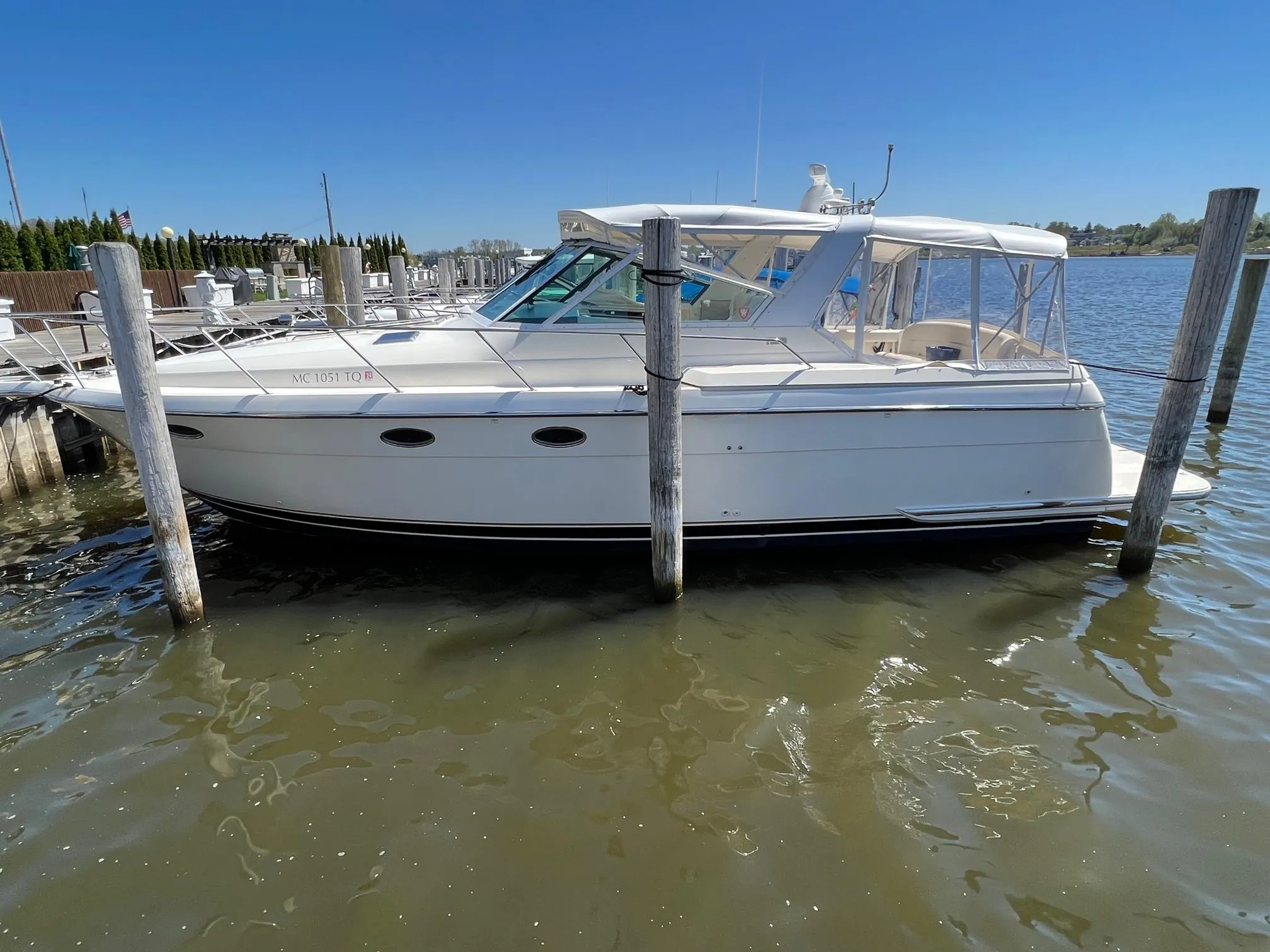 The Cleanest and most updated, ALL freshwater 35 Express you will find.  An unfathomable amount of updates and upgrades including over 50k spent on New Mercruiser 496 engines (NEW from Mercruiser not rebuilds), running gear, (Props tuned and adjusted as well as new cutlass bearings) and digital gauges (Simrad GO7) in 2021 (approx. 74 hrs.).  The engines were installed by Mercruiser Certified Advantage Marine in Holland, MI. Several people have called and aksed "Why new engines?"  like we are hiding something.  We were losing compression in one motor and were told it was a matter of time before the other one did the same (first gen. 502s were not great motors).  Rather than rebuild motors that were not great to begin with we decided to put ALL NEW ones in...we planned on keeping the boat for a long time.  However, life is fluid and the job change came and now it needs to go.  The boat also has New Camper Canvas over 2020-21 (I have multiple drop curtains and seat covers if you do not like camper canvas).  New Fridge 2023. New Battery charger 2025.  New Icemaker 2024, New Engine Batteries 2023 and House in 2024. Anchor rode replaced w/ 100 ft. of anchor chain 2022, Windlass completely serviced 2024. Both AC units serice and cleaned the last two seasons. $6000 Hurley H3O plus Davit system added 2019 (750lb. capacity..there is NO dinghy coming with the boat).  New bilge pumps including mid bilge in 2023. Multiple hatches re-bedded over the past 4 years.  The other electronics are Garmin (2013) and include, GPS, Radar, Autopilot and VHF...all are operational.  Fusion BT stereo with 4 of the 8 speakers having been upgraded in the last 2 years.  ALL new LED cockpit and arch lights.  The boat also has a fully operational Westerbeke Generator(470hrs).  It is service every year by Advantage Marine and both gennie and engines have just had impellers done. Always professionally maintained and serviced including professional detailing every year we have owned it.  Kept in Indoor heated storage in the winter.  This is my personal boat and I have most of the receipts for the work.  Lesser 35 Expresses with original engines and way less upgrades have sold recently for low/mid 130s. (FYI- two boat names in pictures...we drove it for 2 seasons before renaming the boat)  The only reason we are selling is due to a major life change and we will not have time for the boat.  Fresh bottom paint for the season!  Our loss is your gain.  This is a turn key boat!