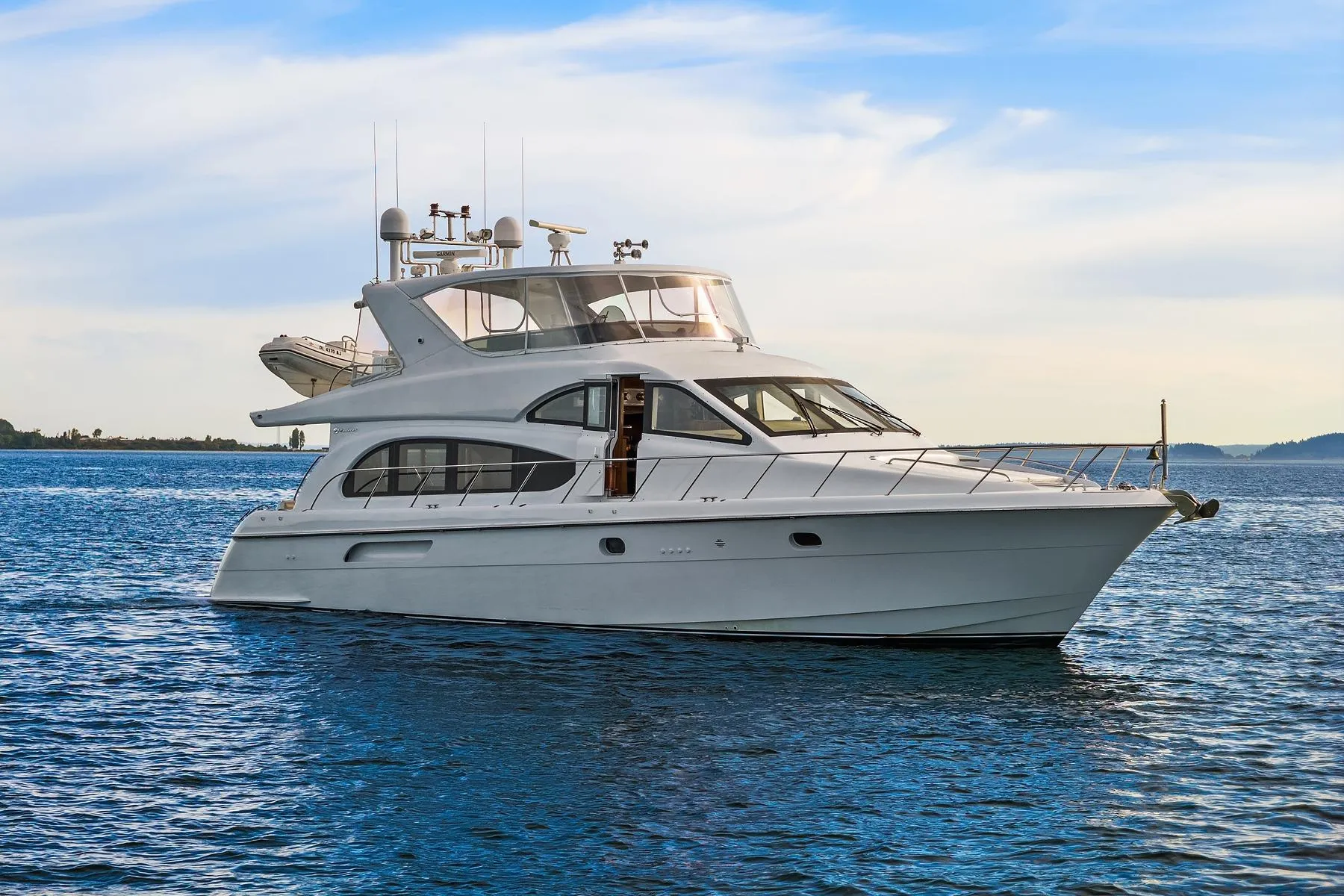 Well-equipped Hatteras Motoryacht featuring CAT 3412E engines, twin Onan 21kW generators, teak cockpit and flybridge, enclosed flybridge, and custom interior. Three staterooms with en-suite heads (bathtub in master), walk-in engine room, upgraded portlights, and aft deck with varnished inlaid table. Freshwater moored in South Lake Union – easy to view!