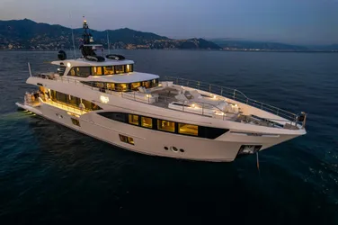 Introducing the stunning Gulf Craft Majesty 100, a remarkable motor yacht that combines elegance and performance. This used vessel, measuring an impressive 33.05 meters in overall length, showcases a sleek semi-displacement fiberglass hull designed for both stability and speed. Powered by two MAN V12-1900 diesel engines, each delivering 1,874 horsepower, the Majesty 100 promises exhilarating cruising experiences with a cruising speed of 15 knots and a maximum hull speed of 19 knots. Accommodating up to 18 guests, this yacht features seven luxurious cabins and seven heads, ensuring comfort and privacy for all on board. The electric windlass adds convenience to anchoring, while the joystick control enhances maneuverability, making it a pleasure to navigate. The Majesty 100 is not just a yacht; it’s a statement of luxury and adventure, perfect for those seeking unforgettable experiences on the water.