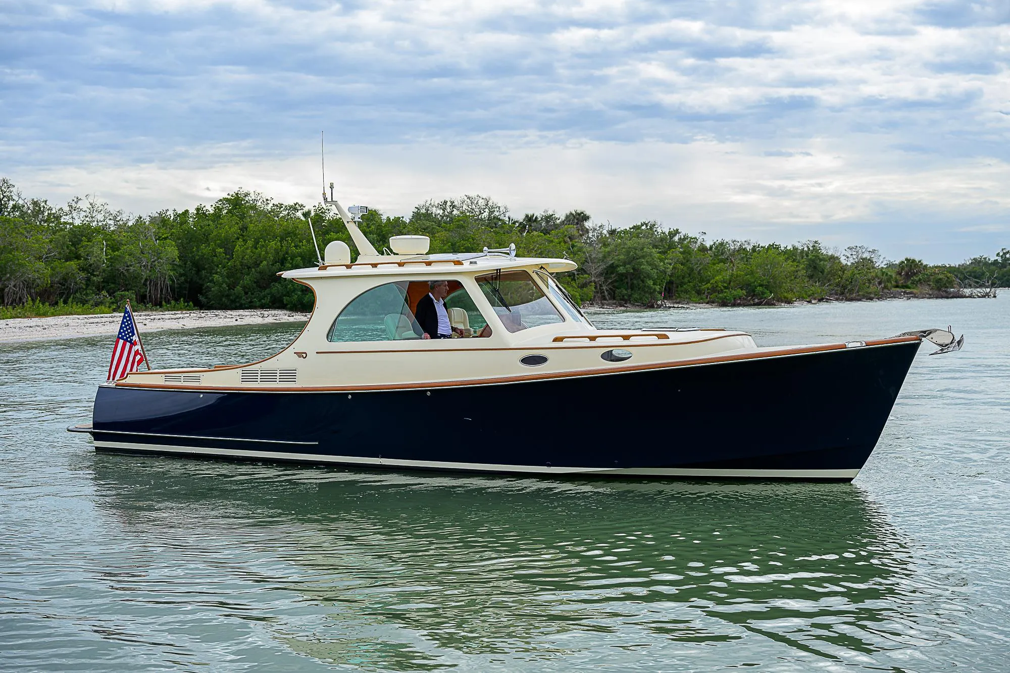 • Rounded, tapered, varnished teak toe rail with Hinckley profile