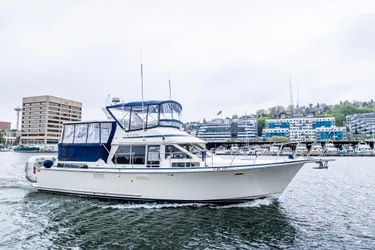The 44 Tollycraft Cockpit Motor Yacht, designed by Ed Monk is a proven coastwise cruiser, offering good seakeeping capabilities, a beautiful teak interior, comfortable owners & guest's accommodations with abundant lounging areas in the salon, foredeck and on the enclosed sundeck and flybridge.