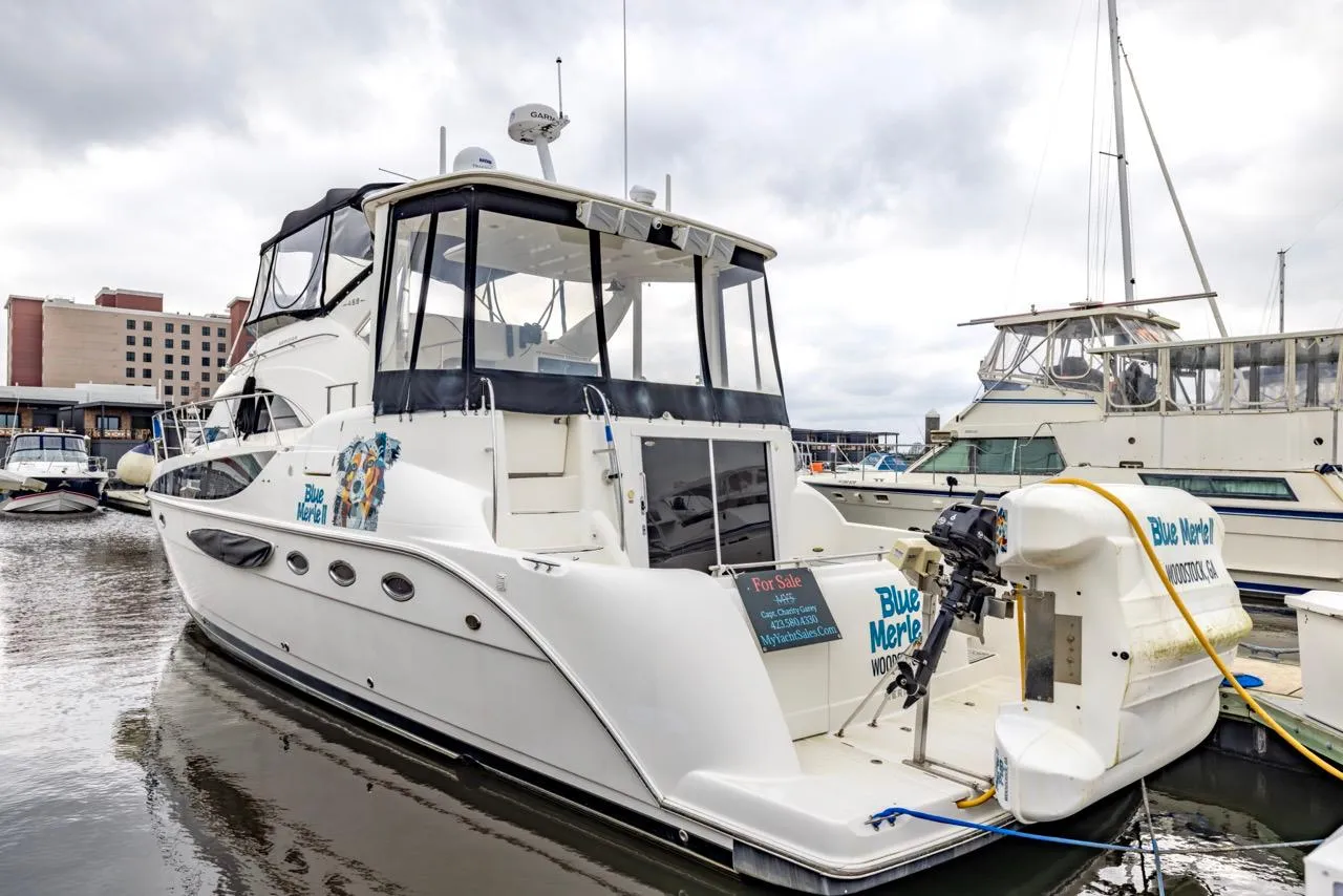 This 2004 Meridian 459 has been very well maintained over the years by her 3 owners.  She has been on many adventures traveling around the "Great Loop" twice and then up the east coast again with her current owner while spending a considerable amount of time on the Tennessee river with her first 2 owners.  As a cockpit Motoryacht she offers her owner easy boarding from fixed or floating docks and an ample combination of indoor and outdoor space.  Her bridge and aft deck are completely enclosed for enjoyment in all weather conditions.  She has had many upgrades and is ready for her next owner.”1000 hr service” completed July 2024.  (Dog decals on sides of boat are easily removed.)