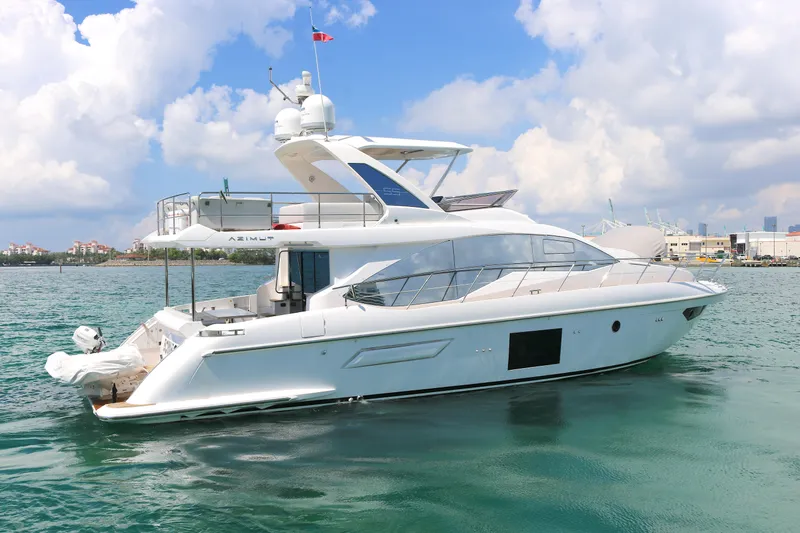 The 55 Azimut, offers a  solution to experience the freedom  of yachting with comfort an Luxury. Bon Bon features a 3 Stateroom Cabin Layout with the Master at midship offering spectacular views through the large side windows. Forward is the VIP In suite stateroom and midship forward Guest with side by side berth.This Azimut 55' Flybridge is a luxurious and innovative yacht that epitomizes Azimut's commitment to exceptional craftsmanship, cutting-edge design, and impeccable performance. With its distinctive lines, spacious layout, and premium amenities, this yacht offers an unparalleled experience for those seeking the ultimate in yachting.