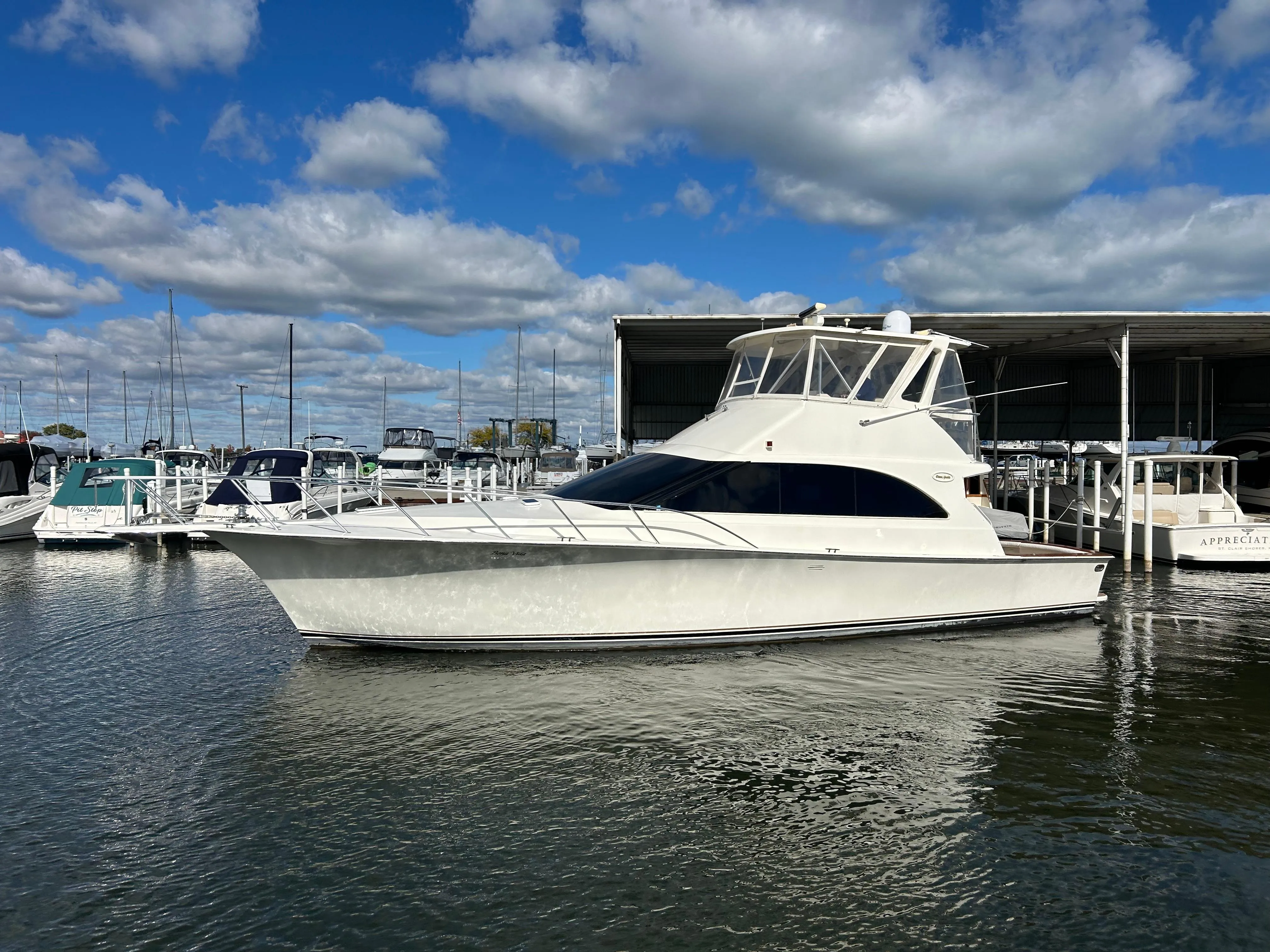 Here we have A 100% Freshwater / Great Lakes 48’ Ocean Yacht. "Bona Vida" features galley up, 3 staterooms and 2 heads. The Flybridge has her factory hardtop with full isinglass enclosure and offers plenty of seating including two Stidd Helm Chairs. She has varnished Teak Covering Boards, Faux Teak Cockpit Decking and an easy to navigate ladder to the flybridge.