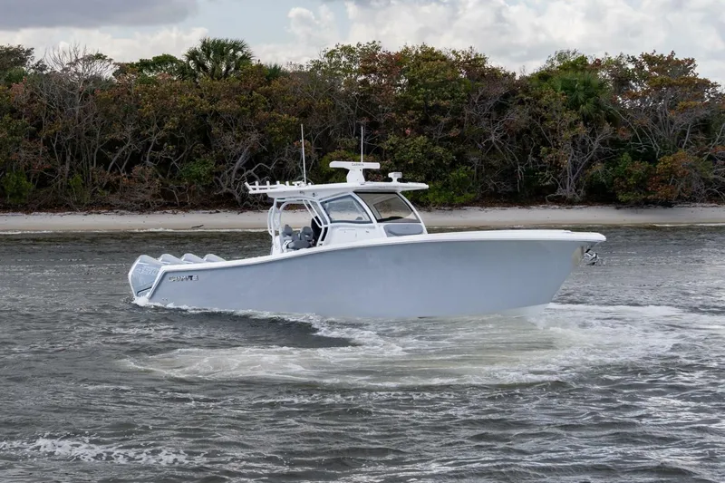 Custom Hardtop w/ Sunroof & Black Framing – Real windshield in frame Bow thruster – (2) 17'' Garmin 8617 - 12'' Garmin 8612SXV – Garmin XHD 24 radar - Nite Track infrared – Garmin multi-colored Shadow Caster Light System – Forward & aft spreader light system – Gemlux Carbon Fiber Outriggers - Dive door - Day cabin w/ marine head and sink- Custom elongated diamond SeaDek flooring - cup holders in gunwale and leaning post - JL Speakers (22); (2) 12-inch subs and (8) amplifiers - Custom integrated coffin box dual lounge seat w/ insulated cooler forward - Full-transom fold-out seat w/ backrest - Custom three-sided acrylic windshield - Custom Horn Blaster Train Horn and compressor - Custom gelcoat hardtop w/ sunroof - Large fish boxes w/ macerator - (3) livewells - Raw and freshwater washdowns - 645 gallon fuel tank; 60 gallon freshwater tank - Trim tabs - Exterior Custom Storm Grey Hull - Hardtop w/ Sunroof & Black Framing - Custom Paint & Gelcoat on Hardtop - Dive Door w/ Stainless Swim Ladder - Rigid Rubrail w/ Stainless Insert Cup holders in gunwale and leaning post - Underwater Lights – Gemlux Carbon Fiber Outriggers (15) Rod Holders Across the Transom(2) 30 degree Rod Holders(2) 15 degree Rod Holders Cockpit Custom elongated diamond SeaDek flooring – Full Transom Fold out Seat w/ Backrest - Raw & Freshwater Washdowns (2) Large Fish boxes w/ macerator(3) Livewells Helm Custom Three-Sided Acrylic Windshield - Custom Horn Blaster Train Horn and compressor - (2) 17” Garmin 8617 - (1) 12” Garmin 8612SXV - Garmin XHD 24 radar - Garmin GSD 25 Sounder Module Sonar Garmin GXM - 54 Sirius Weather Module Garmin VHF 315 Marine Radio Garmin multi-colored Shadow Caster Light System - Bow Thruster - Transducer - Additional 12V Outlet - Overhead Military Switching System Bench Seat w/ insulated Storage Underneath Glove Box for Dry Storage Day Cabin Marine Head Marine Sink Bow Custom elongated diamond SeaDek flooring - Custom Integrated coffin box dual lounge seat w/ insulated cooler forward – Stainless bow and stern eyes Dual Layer Oversized Storage Compartments Recessed Anchor Locker Electronic/AV(22) JL Speakers - (2) 12-inch subs & (8) amplifiers Engine Room 645 gallon fuel tank; 60 gallon freshwater tank – trailer options are available but not included.