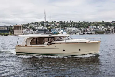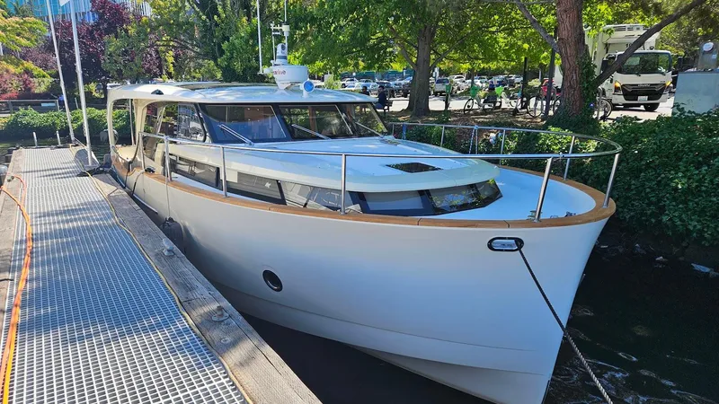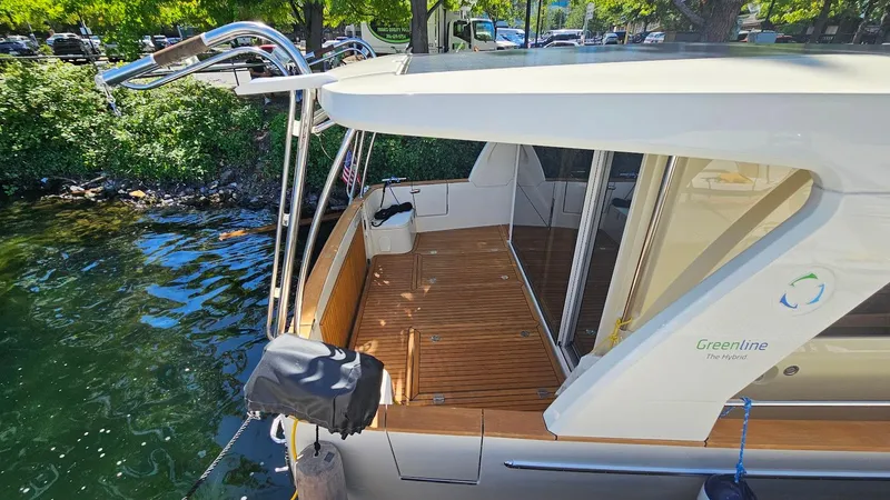 M/Y Bryanne is a 2014 Greenline 40 Hybrid with only 483 hours. Her owner is moving up. This is an opportunity to own a well equipped yacht for much less than replacement cost. She is exceptionally appointed with an owner's stateroom that features a large double berth forward and a guest stateroom on port with two side-by-side single berths that can convert to a double. The head is spacious with a large stall shower that features a companion way door for the guests and an in-suite privacy door to the master. Bryanne's equipment includes: tropical air conditioning, diesel forced air heating, and a full complement of Raymarine navigation electronics. She features six standard solar panels to keep you charged up at anchor, an electric sunroof, and a fold-down electric transom for easy boarding. Her galley features a fold-out glass door and counter extension for entertaining, a full-size refrigerator-freezer, and induction cooking.